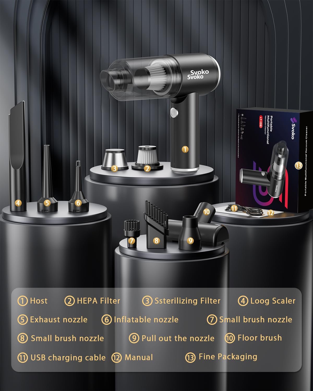 4-in-1 Multi-Function Design: Vacuum, Blow, Inflate, Dust, This 4-in-1 portable vacuum cleaner for home use and travel works as a vacuum, blower, inflator, and duster. It comes with different nozzles to clean tight spots like sofa gaps, keyboard, car corners, and window frames without any problem. You can also use it to fill air in balloons, swimming rings, and air mattresses. Very handy for both home and outdoor use, making it a great vacuum cleaner for car use too.