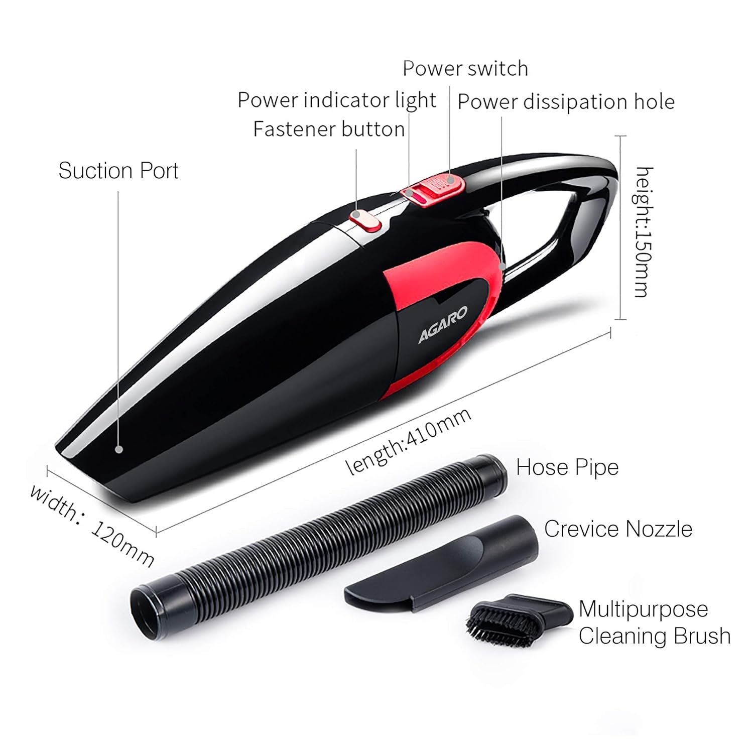 Includes hose pipe, crevice nozzle, multipurpose cleaning brush