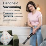 The handheld vacuum uses a 100 Watts motor delivering a powerful suction of 13 kPa