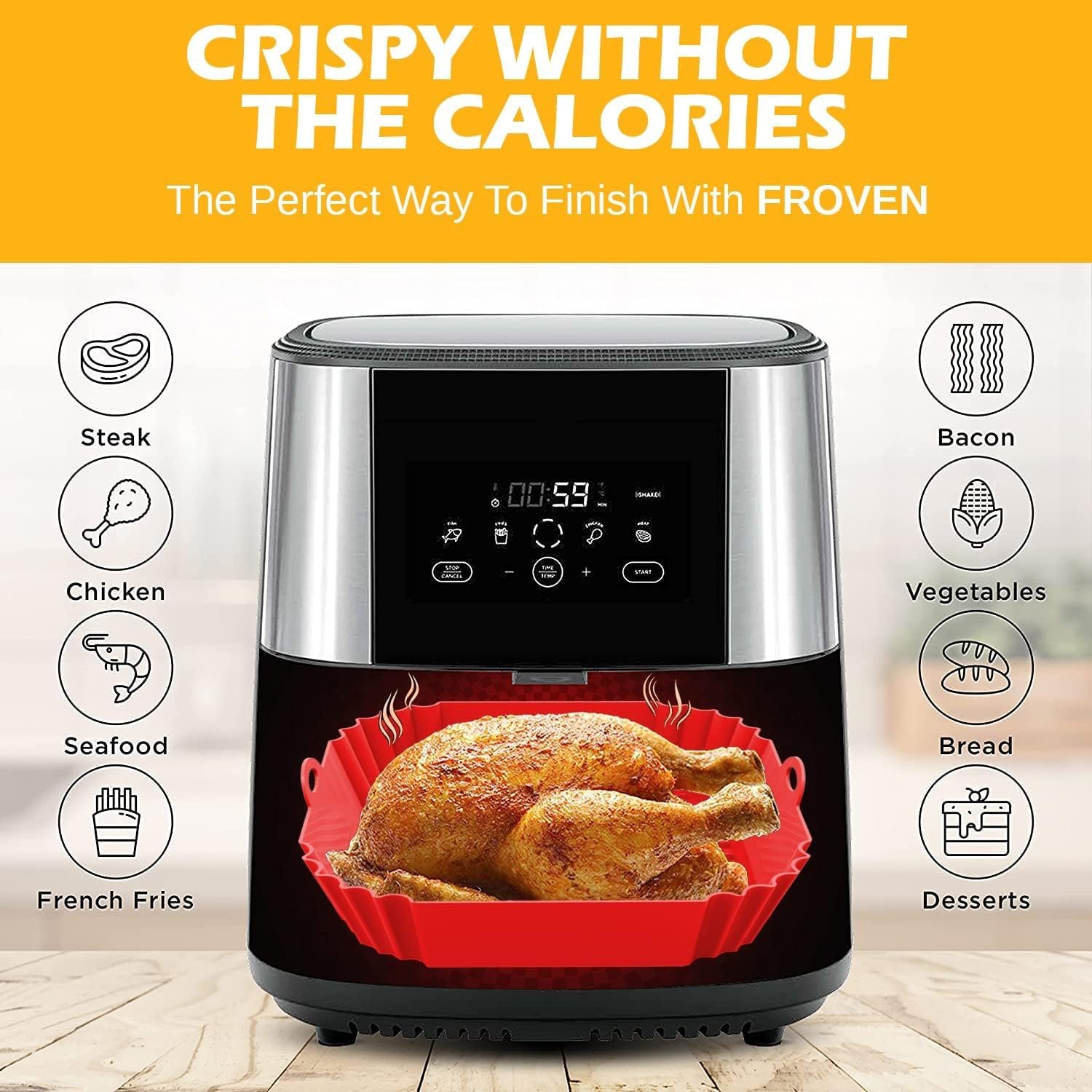 VERSATILE COMPATIBILITY: Fits most 4-7 QT air fryers, conventional ovens, and microwaves with 20.3 cm square silicone liner design for multipurpose use