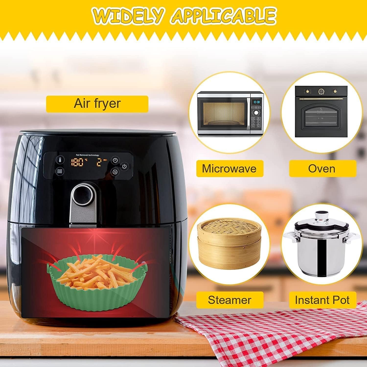 🍟【Practical Design】- The reusable air fryer silicone pot have many raised lines, which improve the circulation of heat to fully heat the food for a more even doneness. Keep your bacon, breads, pizza, turkey, fries, buns integrity and nice look, and no effect on the taste of the food. Our silicone air fryer pot are designed with intimate handles on both sides to protect your hands from burns when removing the silicone pot. They are great kitchen air fryer accessories.