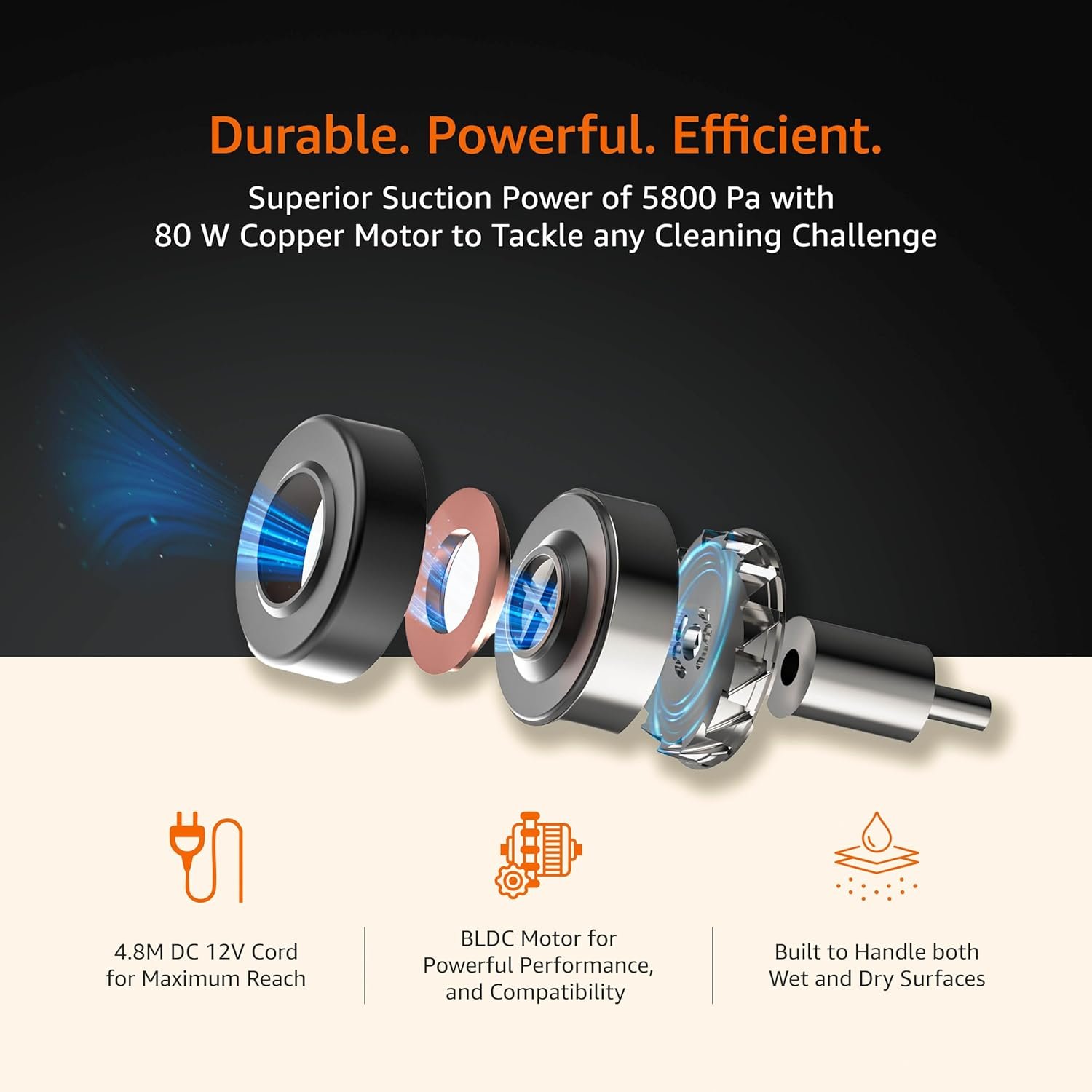 Powerful 5800Pa Suction with BLDC Motor: Delivers strong suction power for efficient cleaning, effortlessly picking up dirt, debris, and pet hair from carpets, seats, and crevices.
