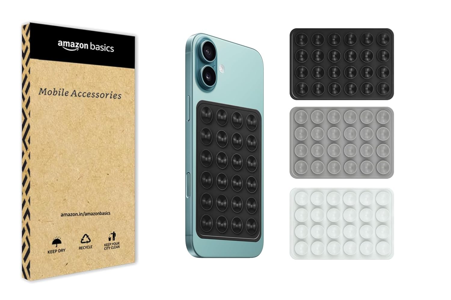 amazon basics Suction Phone Case Anti-Slip Silicone Hands-Free Sticky Pads for Phone Case Mount for Selfies Videos Mirror Shower Car Dashboard – Black,Gray,White (Pack of 3)