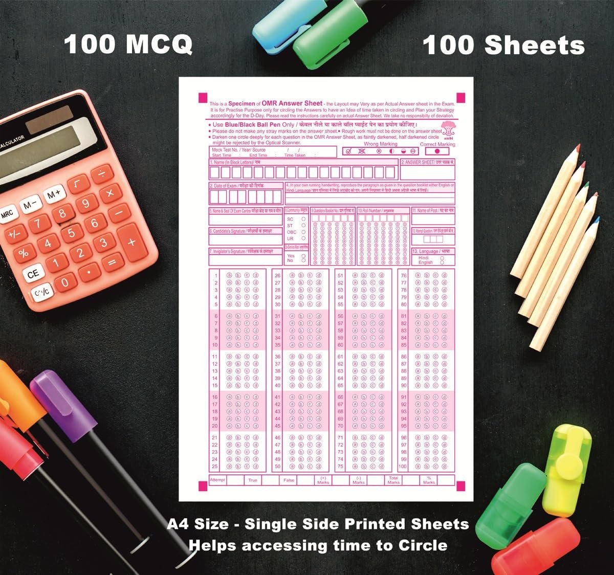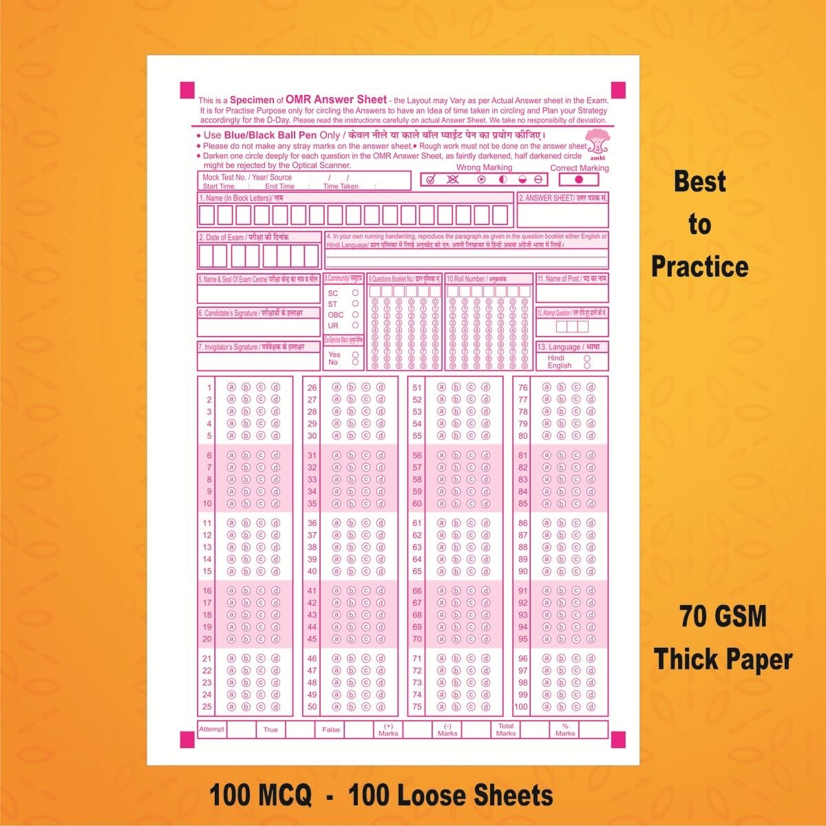 amblitz OMR Sheet |100 MCQ’s | 100 Loose Sheets | OMR Sheet for Practice | A4 Size – 70 GSM Thick Paper | Answer Sheet for Student |