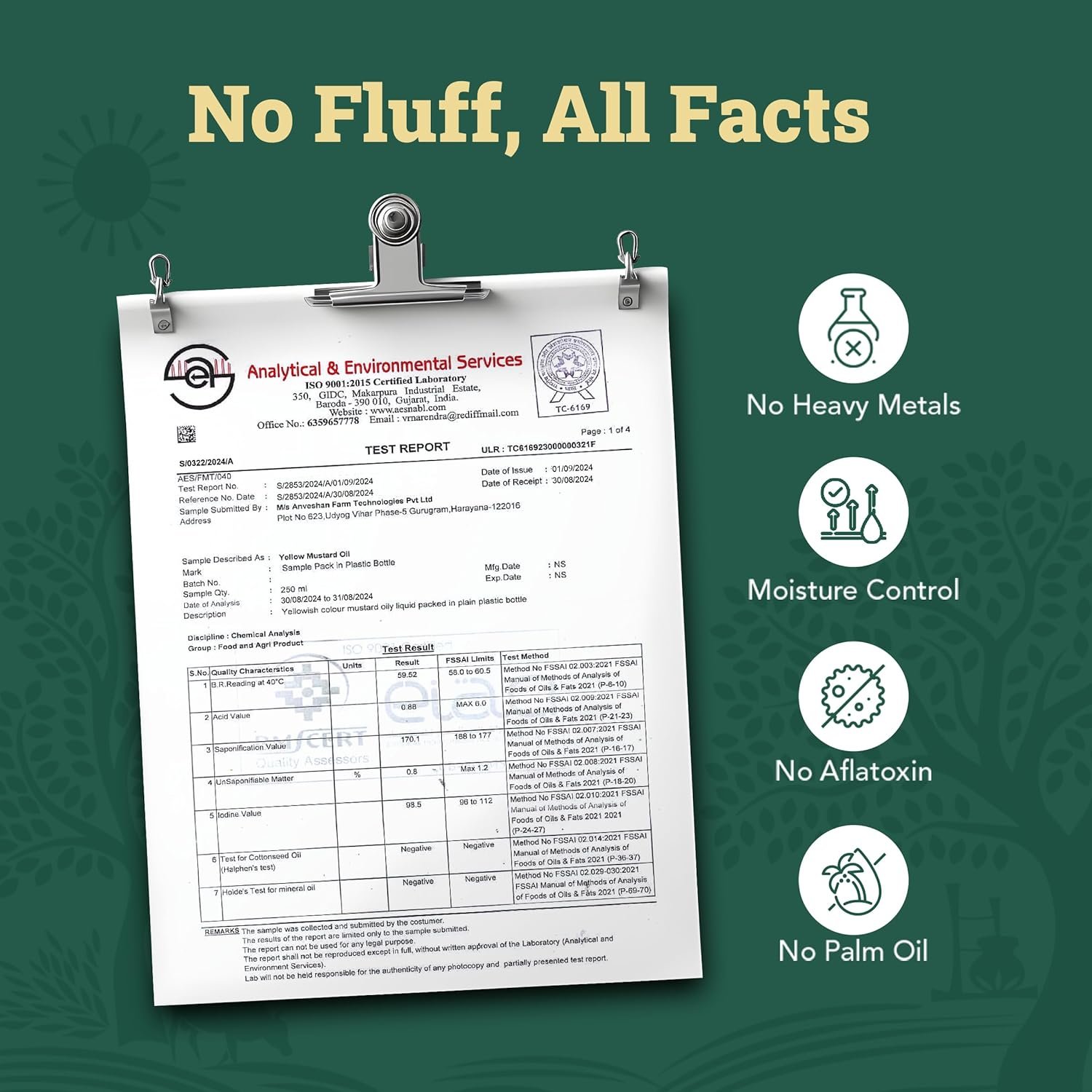 LAB-TESTED OIL: We comply with 17 FSSAI mandated parameters for testing yellow mustard oil and ensure that every batch of our cold-pressed mustard oil undergoes strict quality checks.