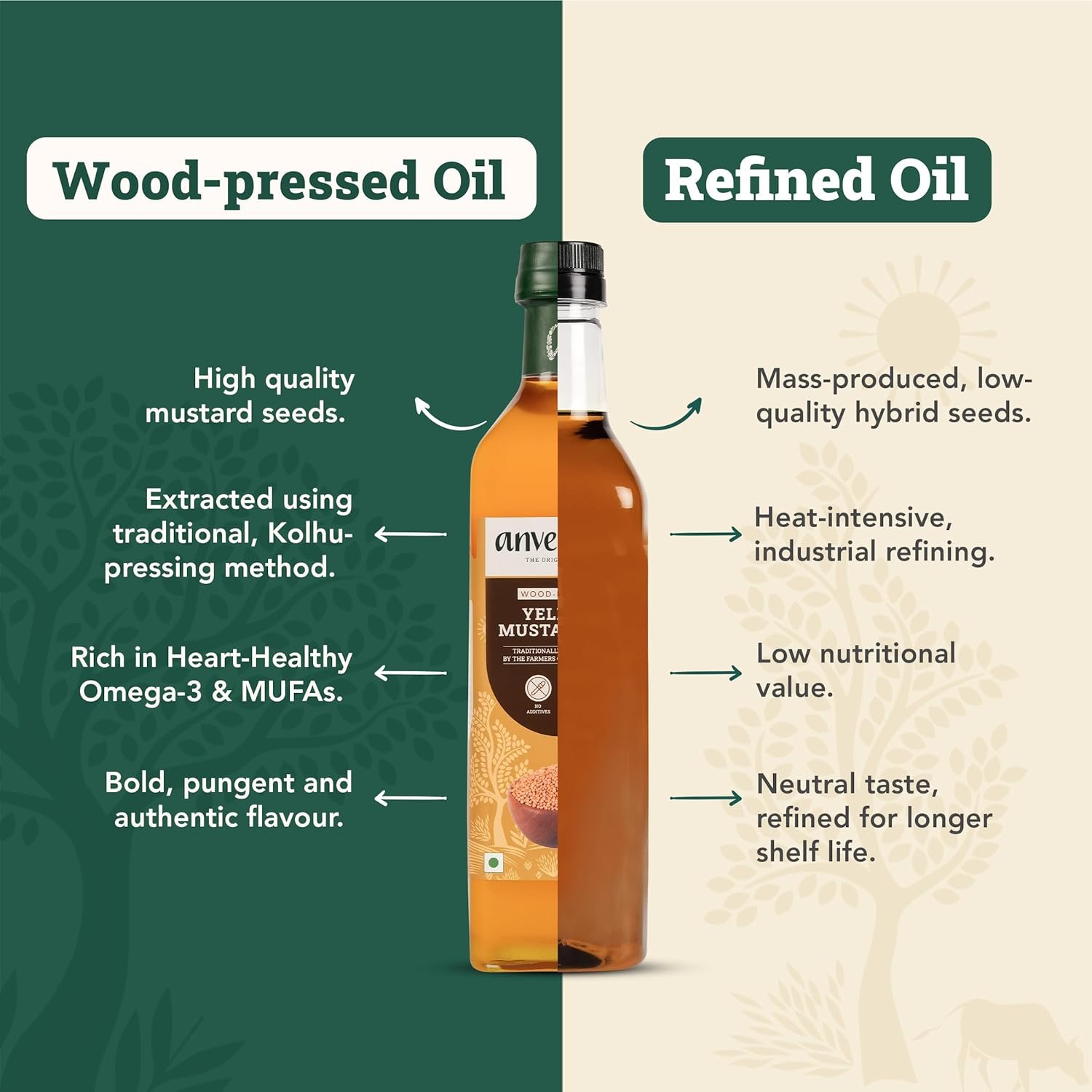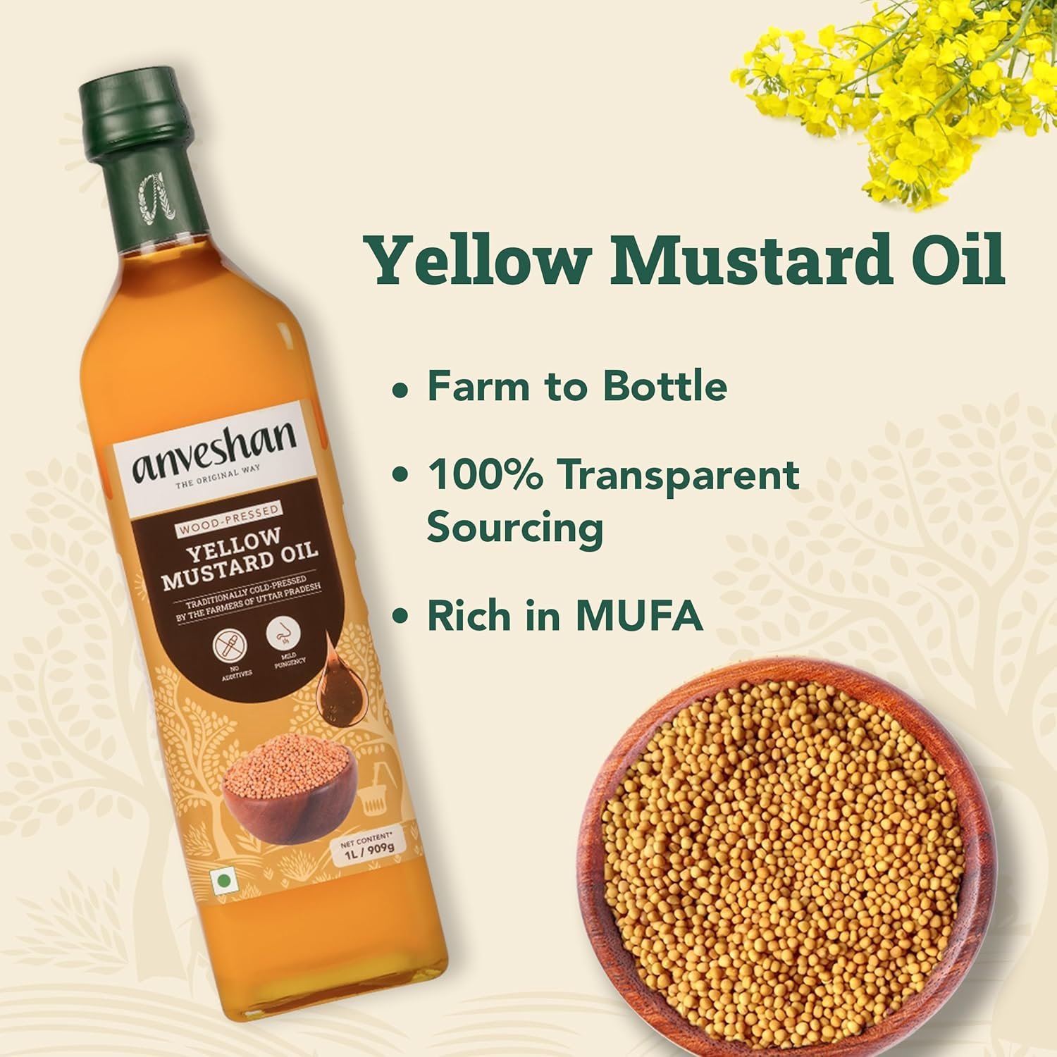 Anveshan Wood Cold Pressed Yellow Mustard Oil – 1 Litre | Glass Bottle | Kolhu/Kacchi Ghani/Chekku | Natural | Chemical-Free | Cold Pressed Mustard Oil for Cooking
