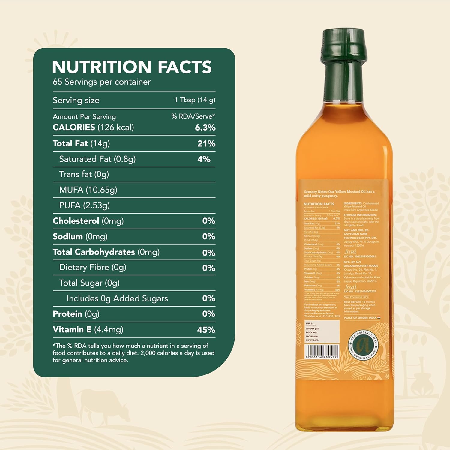 STORAGE INSTRUCTIONS: Our Wood-Pressed Yellow Mustard Oil is best stored in a cool and dry place with the lid tightly closed. We use our high-quality glass bottles for longer shelf life and to preserve quality.
