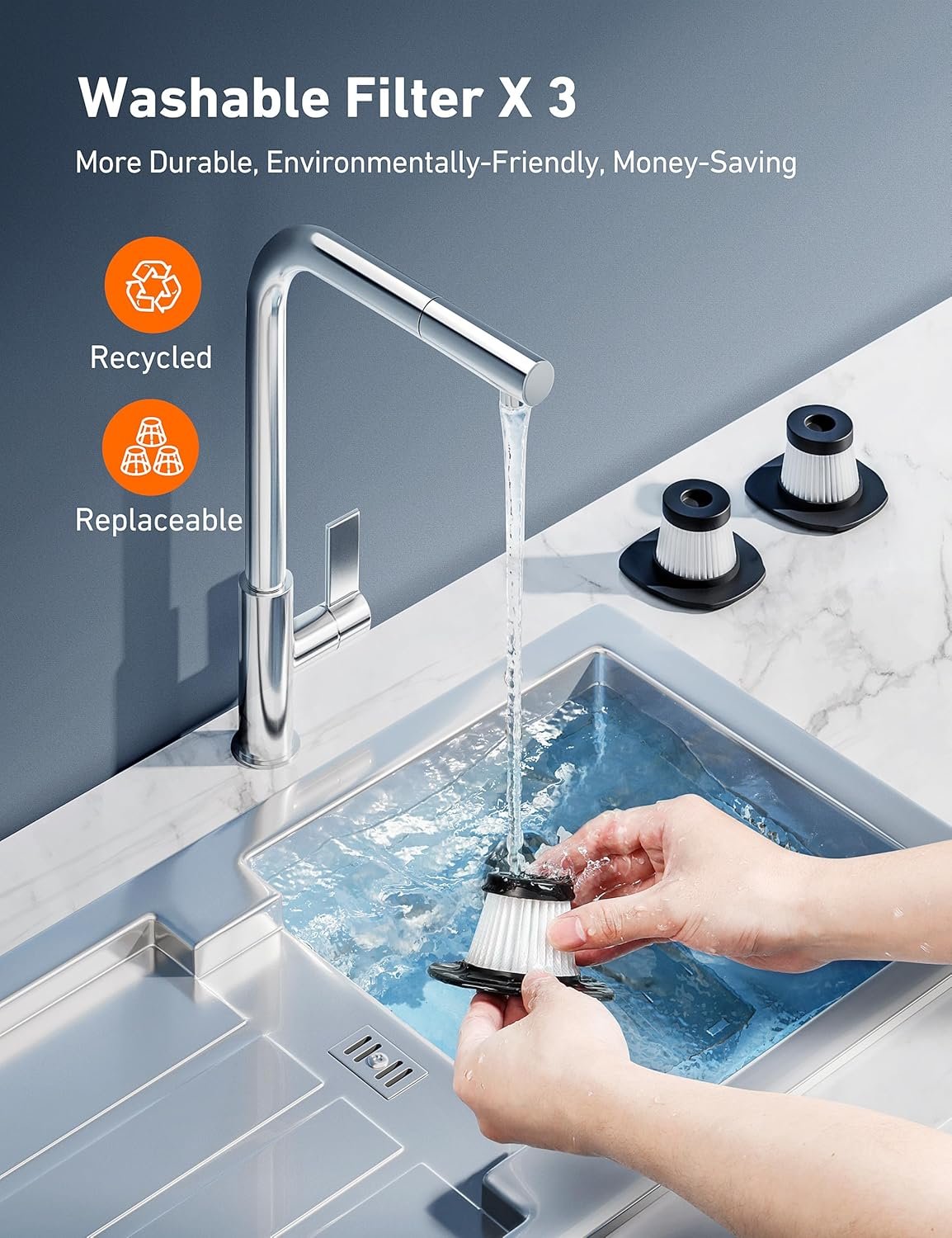 Washable Filter: The filters and dust cup are washable. Extra 2 filters are attached, easy to replace and clean. Please do not wash the body.