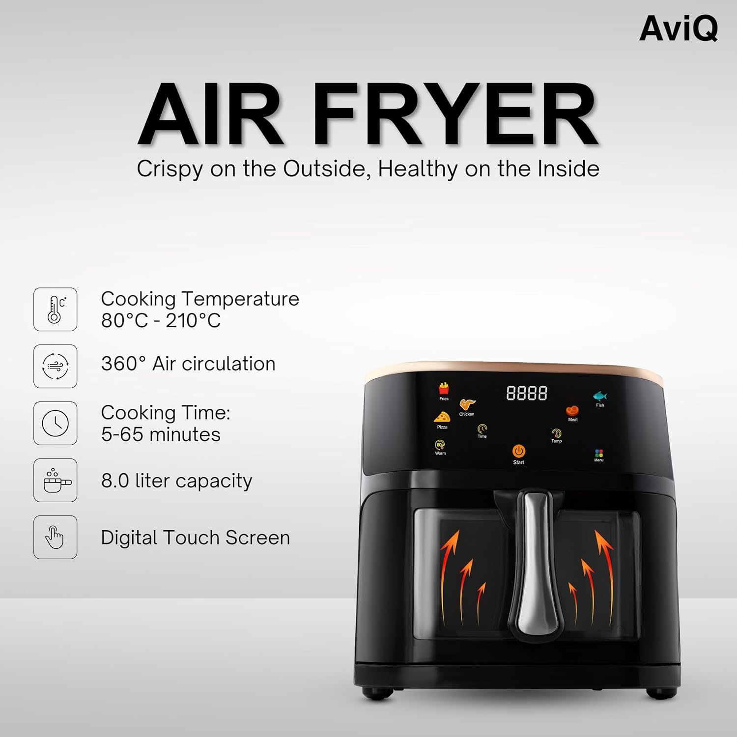 AVIQ Digital Air Fryer 8L,1400W, Bake,Grill & Roast, Upto 85% Less Oil Usage, 6 Preset Menu, Digital Display & Touch Control Panel, Glass Window with in-built Light, Auto Power-Off, Dual Tone Color