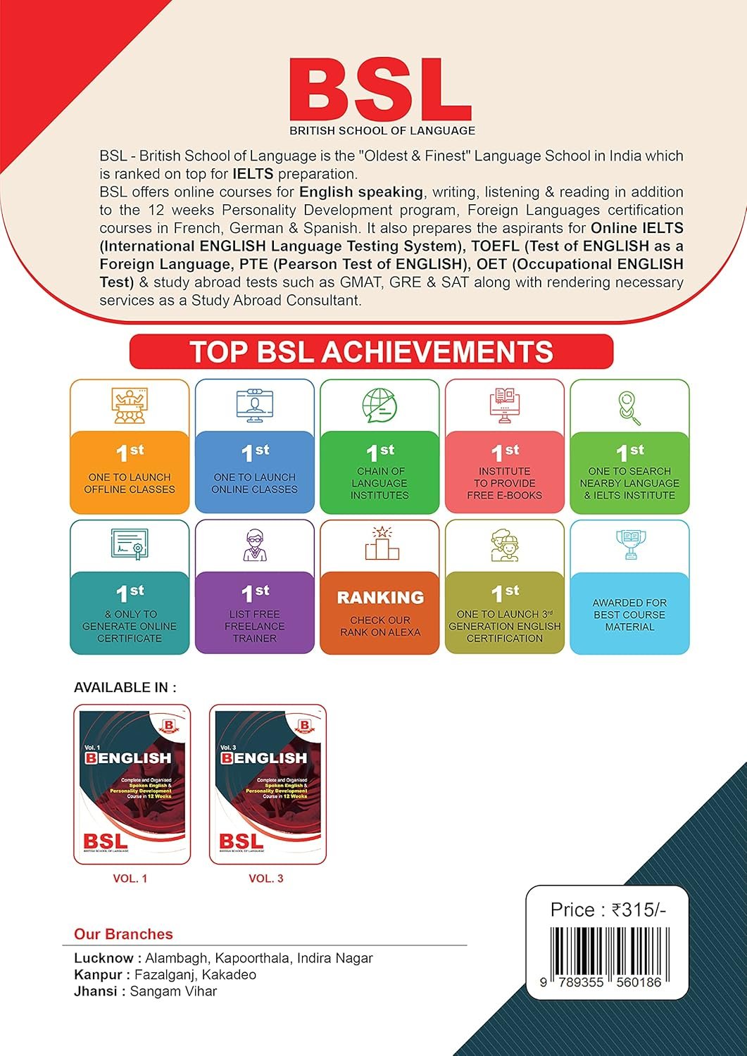 British School Of Languages is here with the best study material for you to learn Spoken English in just 12 weeks! B English is your guide to improve your communication skills with well-researched and latest pattern of English Language. The Book is divided into 3 volumes and covers all the professional upfronts such as Interview Etiquettes, Presentation Etiquettes, blog writing, etc along with all essential topics such as Grammar- Tenses, prepositions, Articles, Active and Passive Voice, Conjunctions and many more along with a distinctive vocabulary to add words to your dictionary. The book is planned in a way that will help you conquer the cooperate world as well as your Entrance exams like IELTS and TOEFL. About BSL :- British School of Language is an institute which uplifts the students from the core level of the English language. Quality assessments and training is more crucial for our teachers rather than quantitative assessment. Our experienced trainers understand the learning style, strengths and weaknesses of the students and make the study patterns feasible. You are Just a step away to step-in the world’s best English speaking course.