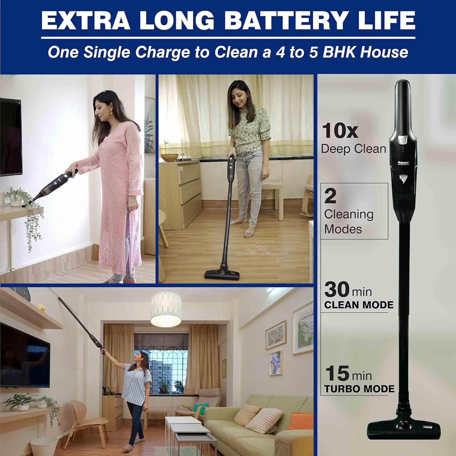 EXTRA LONG BATTERY LIFE: The Balzano Vacuum Cleaner comes with a long lasting and energy efficient lithium ion battery which delivers 30 minutes of power in clean mode and 15 minutes of super power in turbo mode for easily cleaning a 4 to 5 BHK home in one single charge. This wireless vacuum cleaner comes with an easy dock charging station adding style and convenience to your home.