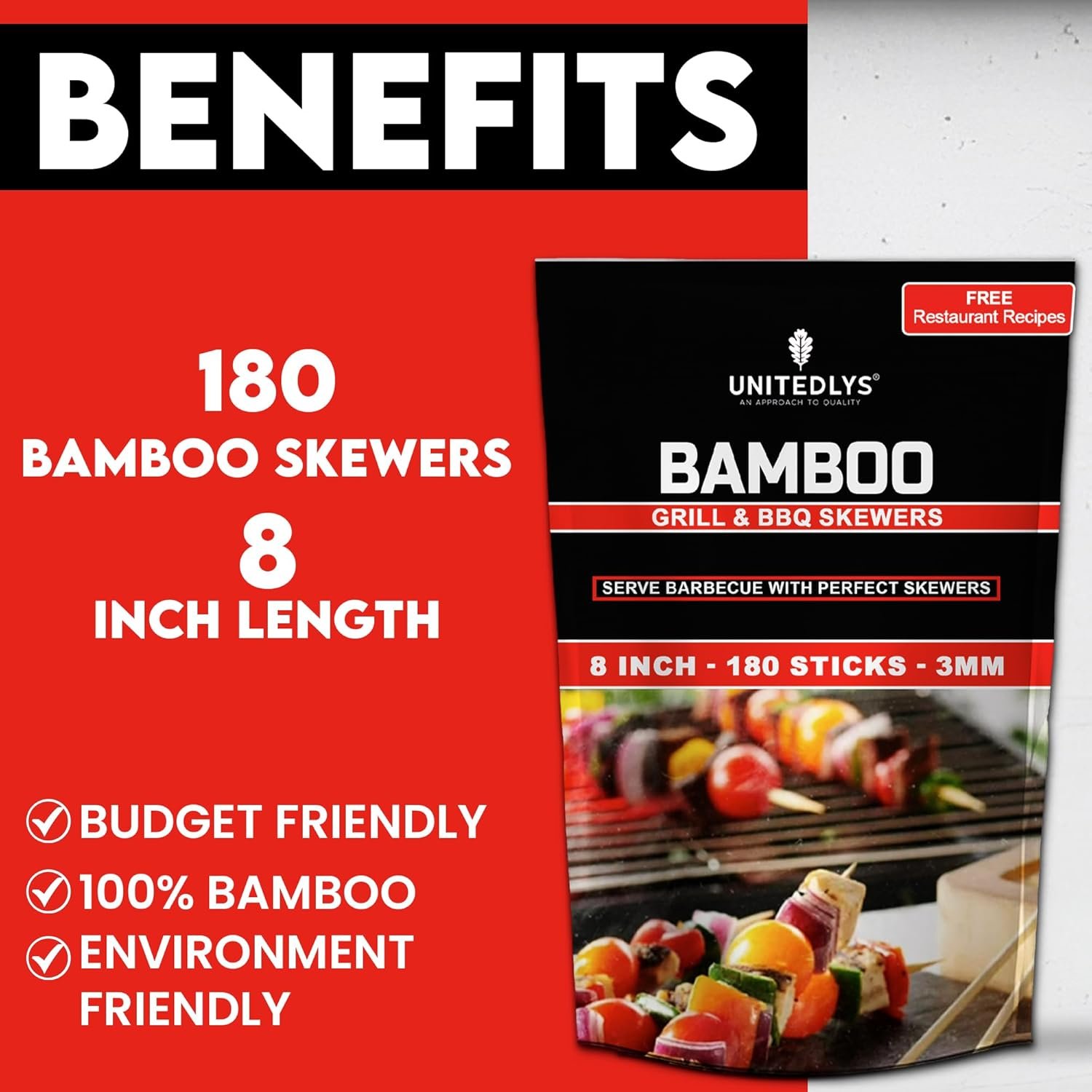 𝐋𝐨𝐧𝐠 & 𝐒𝐭𝐮𝐫𝐝𝐲 𝐃𝐞𝐬𝐢𝐠𝐧: Each set contains 180 wooden sticks. Each grill stick is 8-inches in length with a 3mm diameter for durability and safety. BBQ stick does not get heated so they are safer compared to other wooden skewers sticks , especially if you are looking for something for young kids. They also come with blunted tips and have the perfect length to keep your hands away from the heat.
