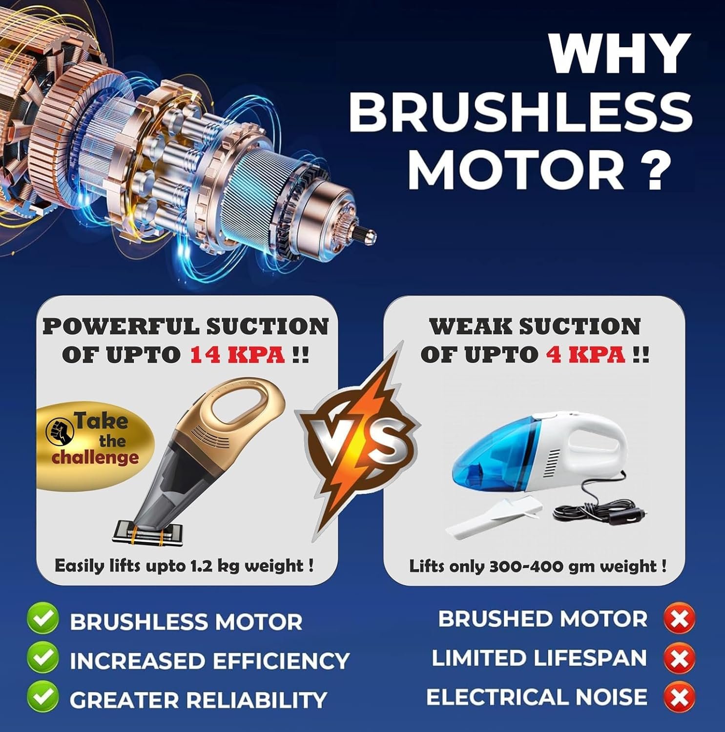 [WITH ADVANCED BLDC MOTOR] – First Time in India – With next generation advanced 150W BLDC Motor which gives a crazy suction power of 14 kpa (v/s 3-4 kpa suction of other car vacuum cleaners !)