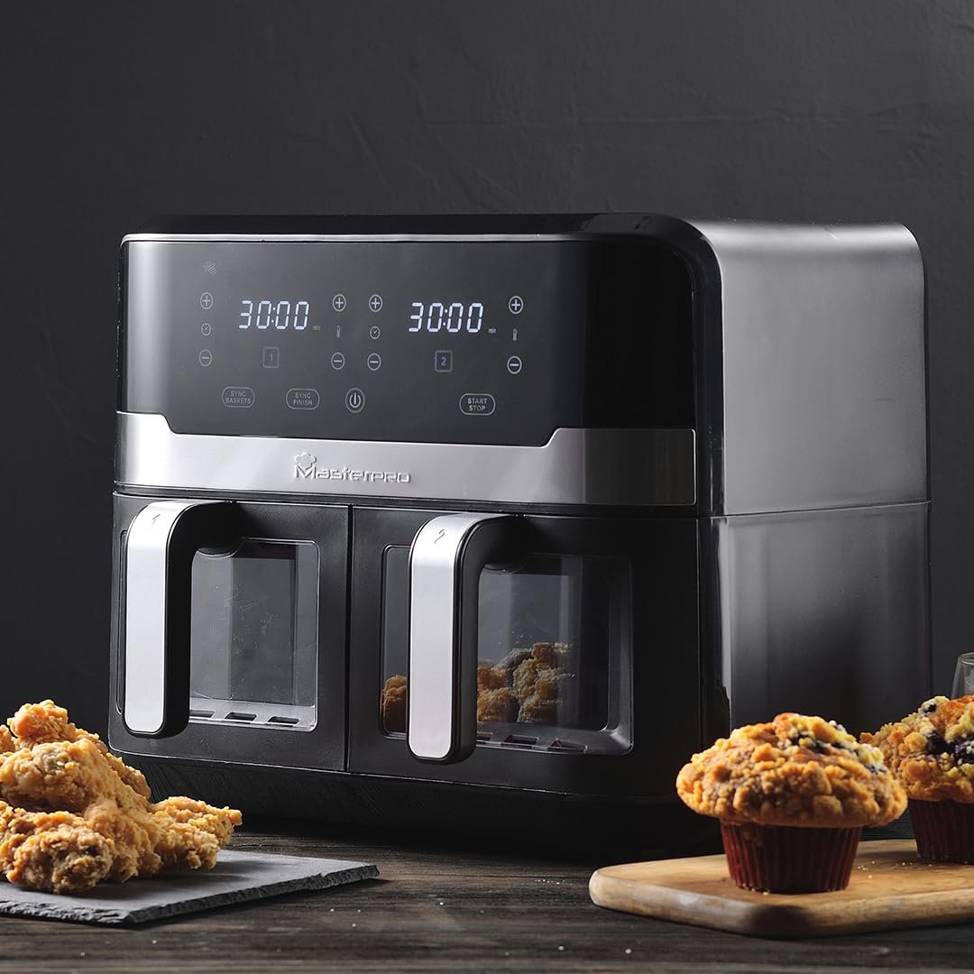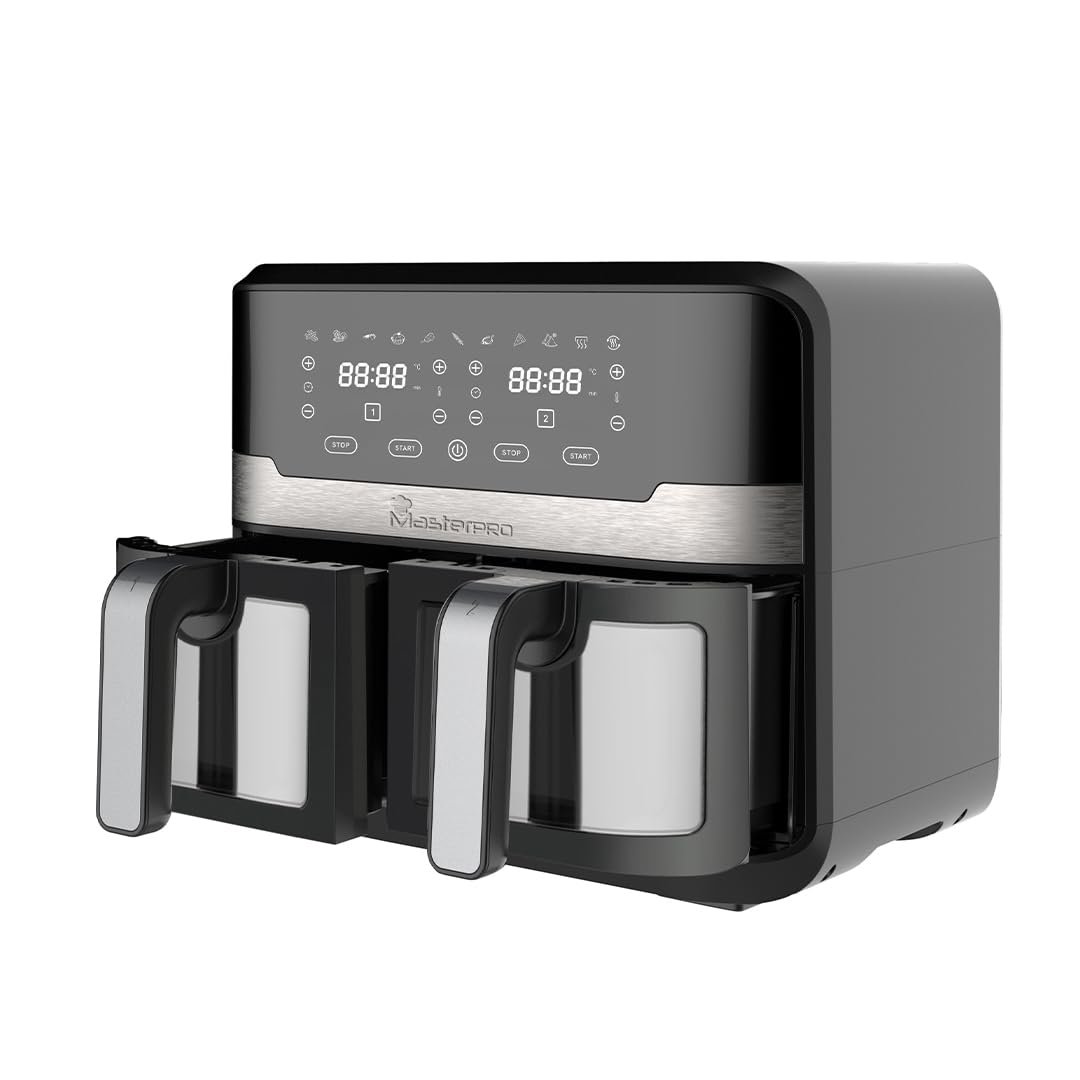 Bergner MasterPro Air Fryer, 2400 W, 9L with Dual Transparent NonStick Buckets, 360 Degree Airflow Technology, Air Fry/Bake/Dehydrate/Bake/Heat/Defrost, Multi Mode Touch Screen with Custom Programs, Black