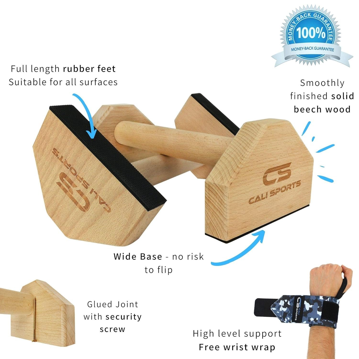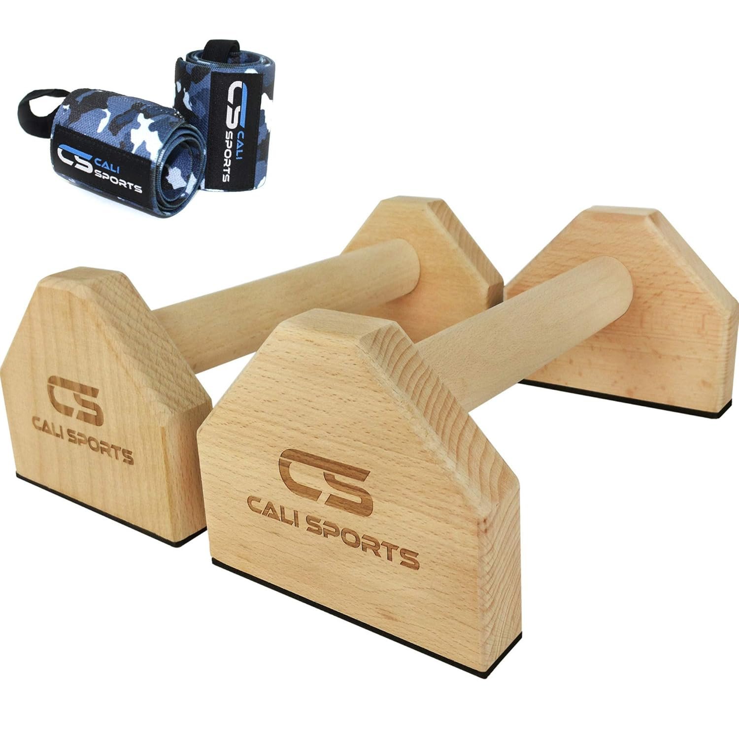 CALI SPORTS Push Up Bar Calisthenics Equipment, Solid Wood Parallettes Bars for Floor Use, Perfect Pushup Bar and Handstand Push Up Handles for Men and Women, Includes Wrist Wraps