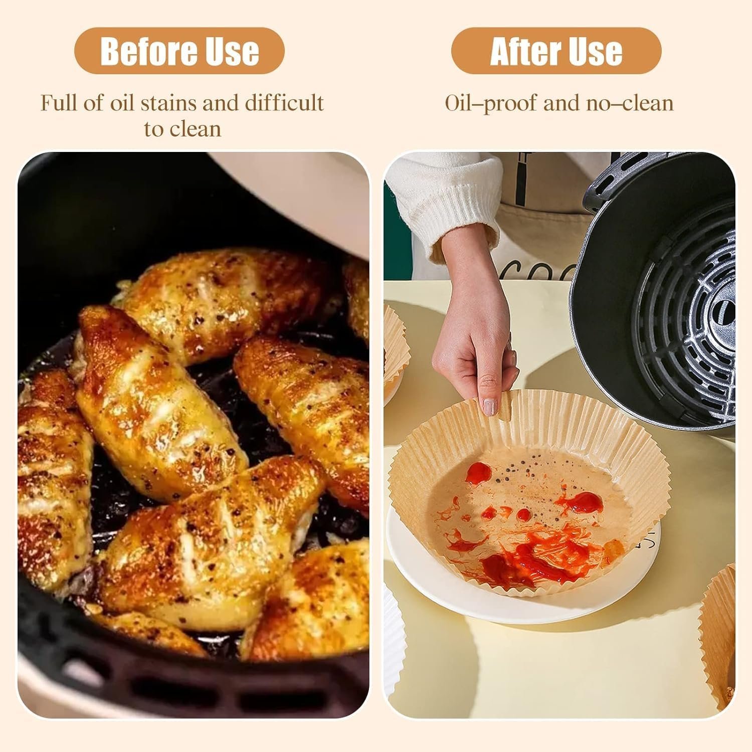 ✔【Eco-Friendly Material】 The air fryer paper liners are made of wood pulp, unbleached, containing no chemical substances.