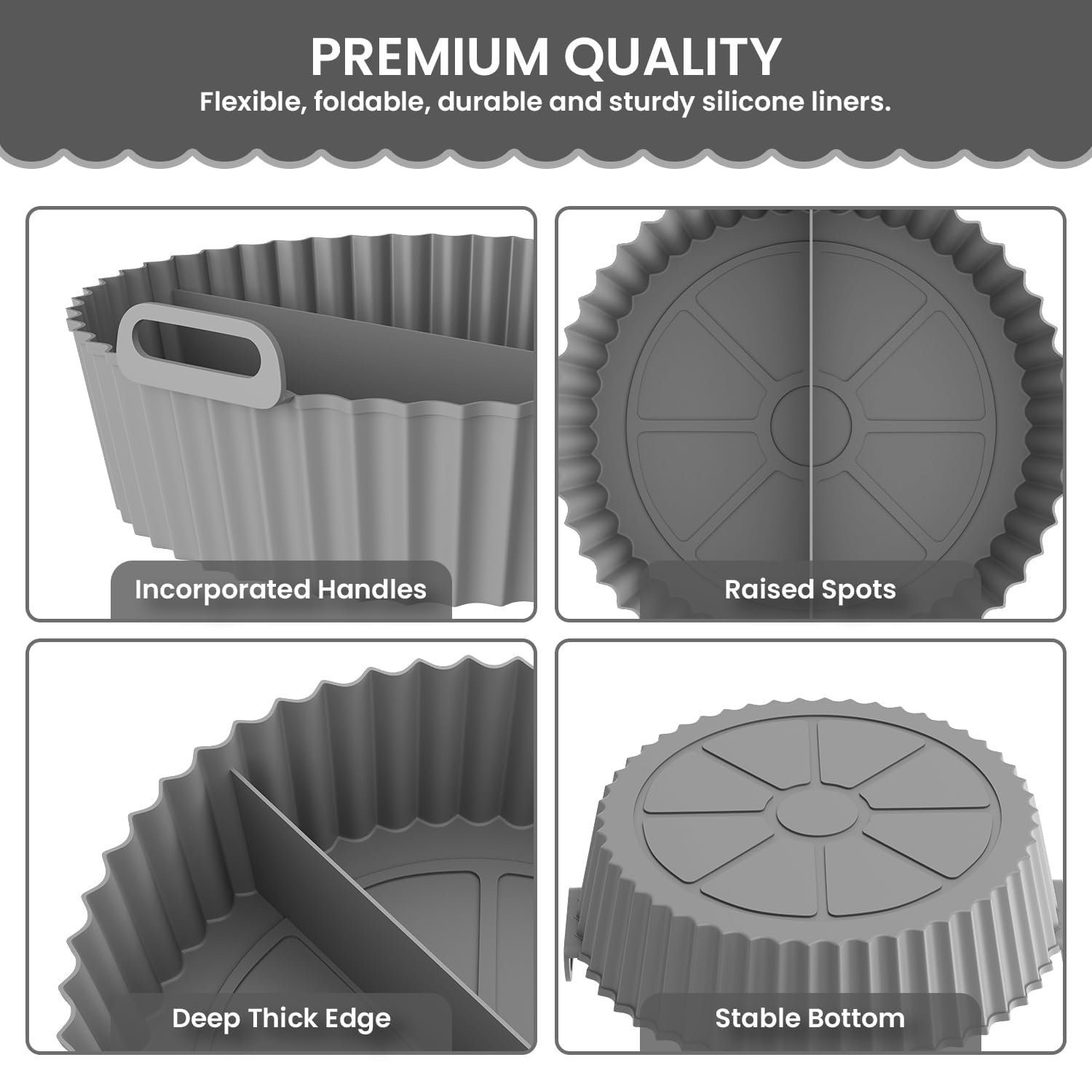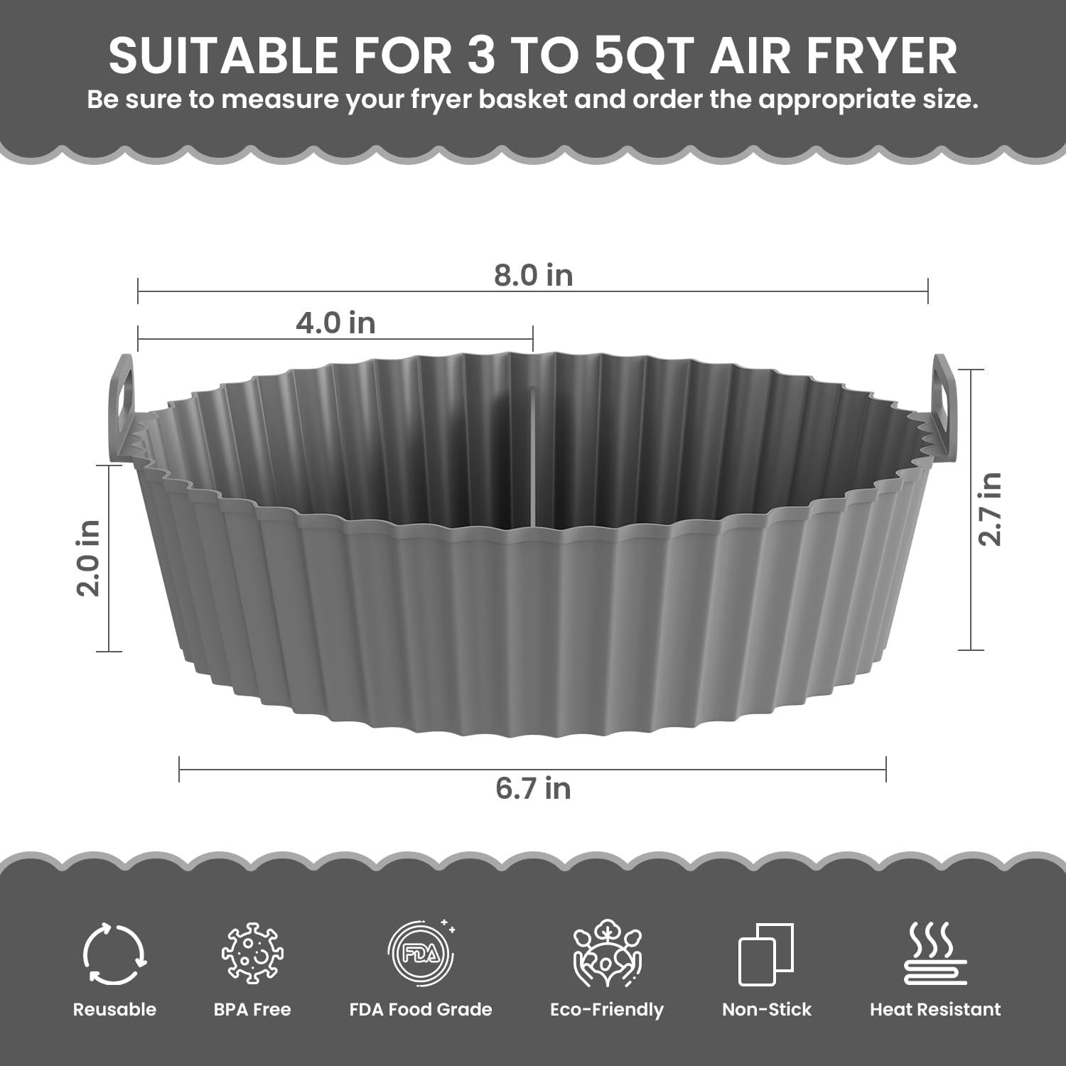 Package Content – Air Fryer Liners. Material: Silicone. Color: Multicolor. Shape: Round I Size: top diameter: 8 inches, bottom diameter: 6.5 inches; height: 2.4 inches and Top 6.5 inches / Bottom 5.5 inches/ Height 1.8 inches. Raised lines on the base allows proper and even circulation of heat. Safe to be used in oven, microwave, freezer and dishwasher.
