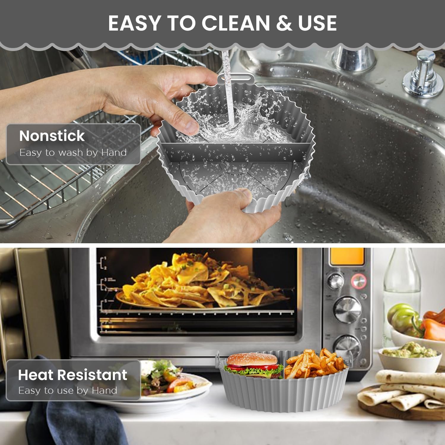 This Air Fryer Silicone Basket Is Made of High Grade BPA Free Silicone Material, Non-stick, Non-toxic, BPA Free, This Is Double Basket and Two Compartment Air Fryer Liners Which Is Highly Heat Resistant Material That Withstands Up To 464°f, We Made This Air Fryer Silicone Liners Reusable And Washable And Also Highly Focused on Certified Food Safe Material.