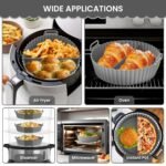 Reusable air fryer silicone pots can replace other air fryer pans or disposable parchment paper. The carefully designed 360°air circulation structure makes the heat distribution more uniform so that your food can be cooked perfectly in a shorter time & no more risk of flammability. The handles makes you take it out easier, Avoid burning your fingers.You can also hang it on the wall for easy storage