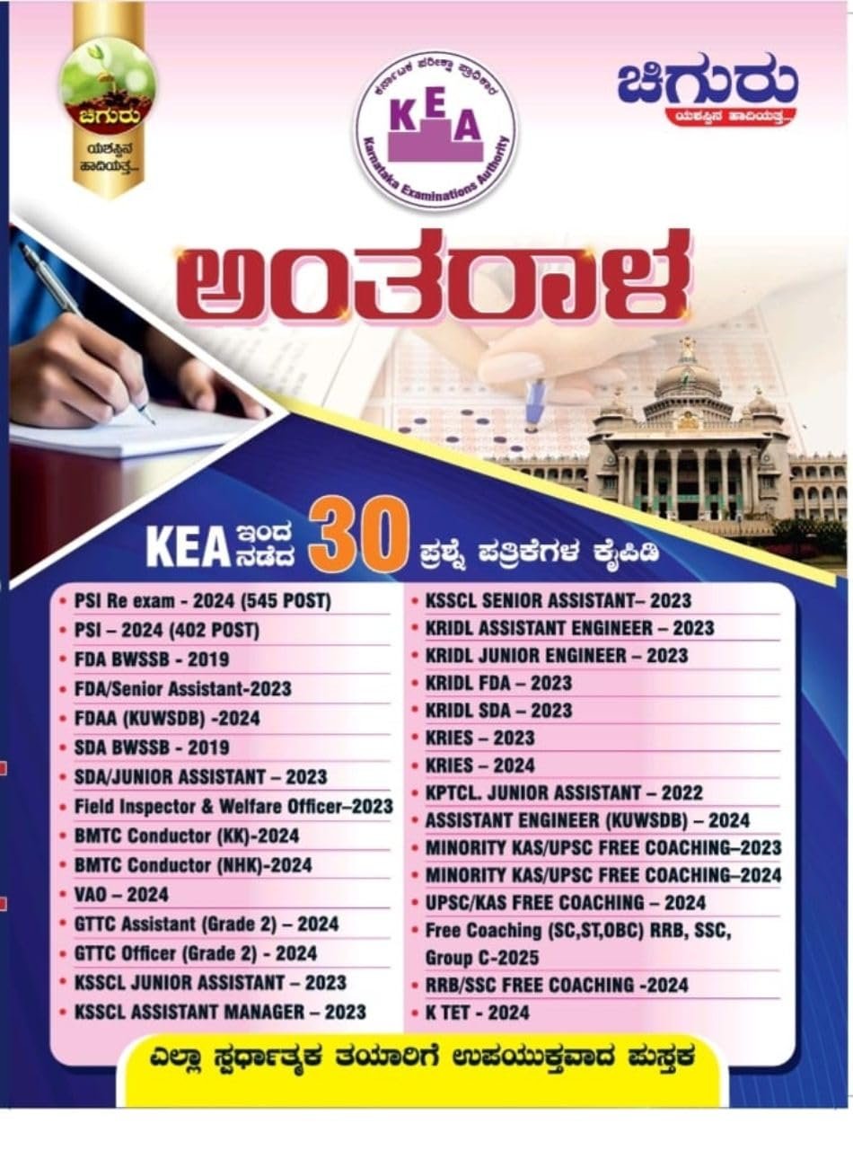 Prepare effectively for Karnataka State competitive examinations with Chiguru’s comprehensive KEA ANTHARALA Question Bank. This invaluable study resource features 30 soled papers conducted by the KEA , useful for KEA and KPSC examinations. The question bank covers various positions including PSI, FDA, SDA, Assistant Engineer, Junior Engineer, and numerous other government roles. Perfect for candidates preparing for upcoming recruitment drives, this soled papers book helps you understand the exam pattern and typical question formats. The book helping aspirants build confidence and improve their problem-solving speed. Whether you’re preparing for KSSCL, KRIDL, KRIES, or other state-level competitive exams, this question bank serves as an essential preparation tool for achieving success in your government job pursuit.