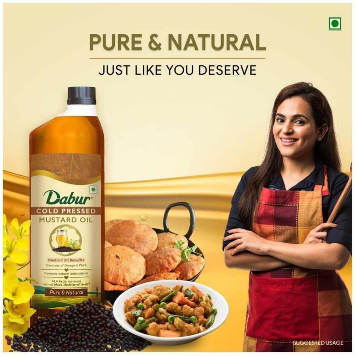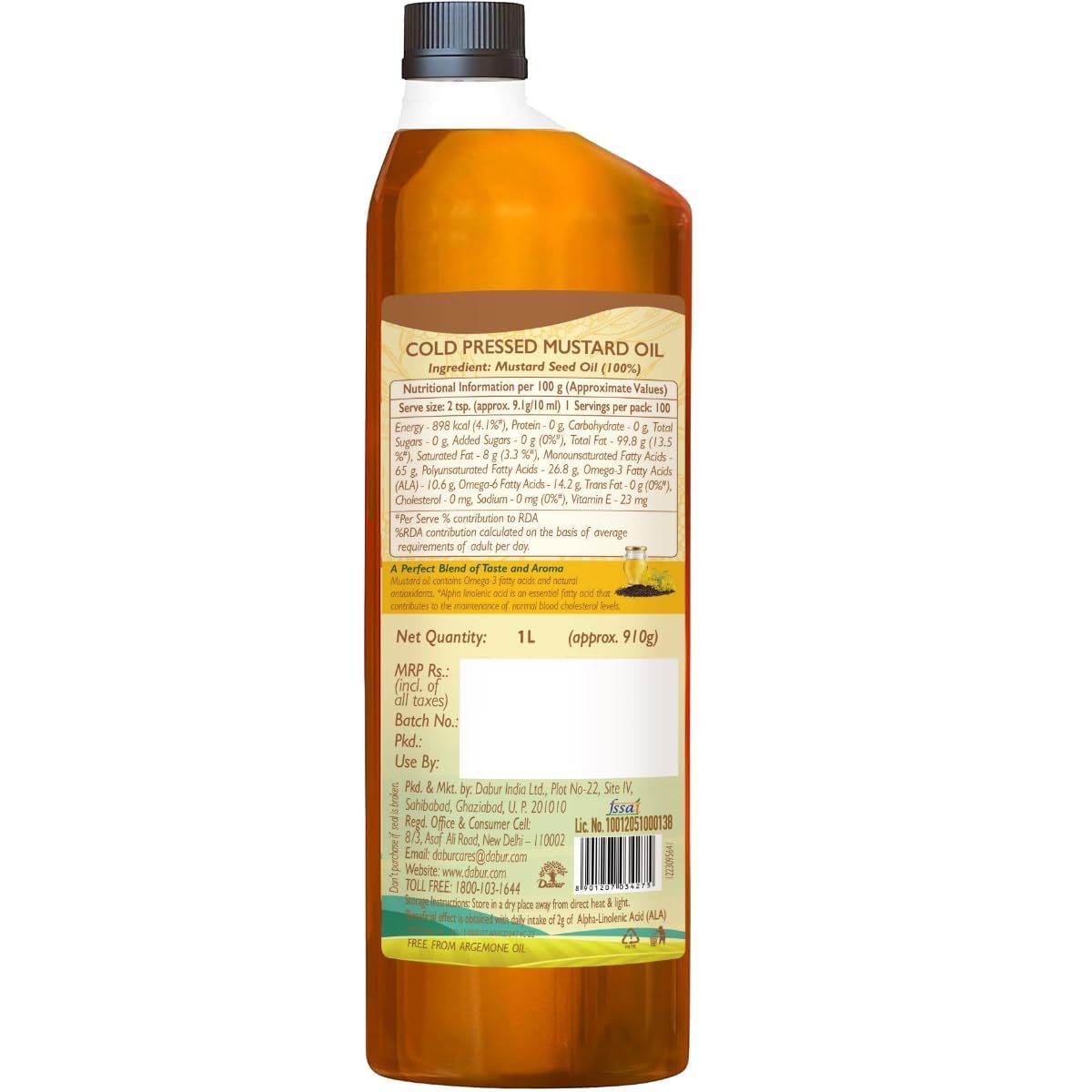 Dabur Cold Pressed Mustard Oil is traditionally cold pressed from finest quality mustard seeds, ensuring that the natural properties and goodness of mustard is intact. It contains goodness of Omega-3 PUFA. Contains ALA which helps maintain normal blood cholesterol levels, where beneficial effect is obtained at daily intake at 2g of ALA. Cooking with Dabur Mustard Oil gives a delicious twist to your dish with great flavour and aroma.