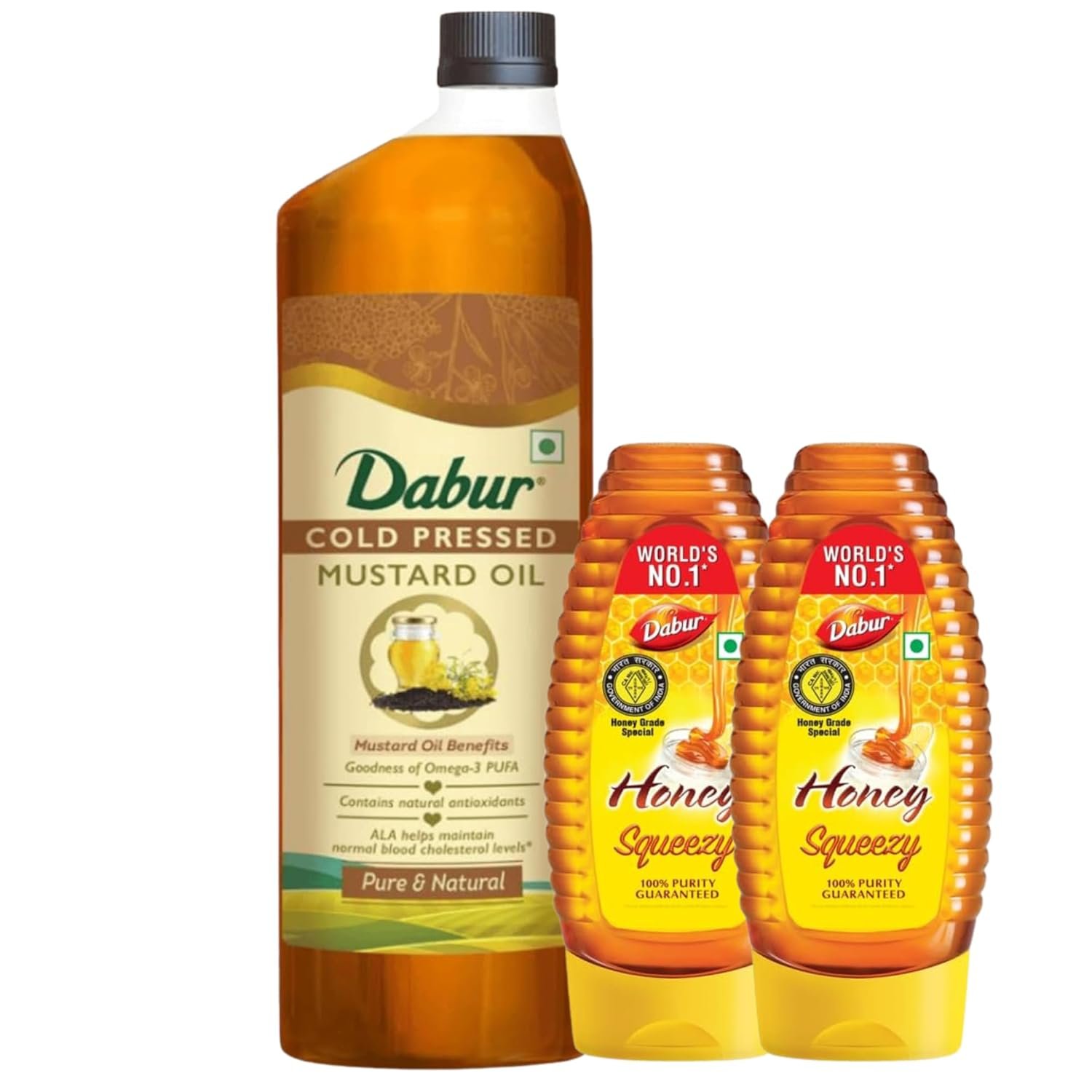 Dabur Cold Pressed Mustard Oil 2L (1l x Pack of 2) + Honey Squeezy Pack – 800g (400g x 2) | Goodness of Omega 3 PUFA & Perfect blend of Taste & Aroma | Dabur Honey – Natural Immunity Booster