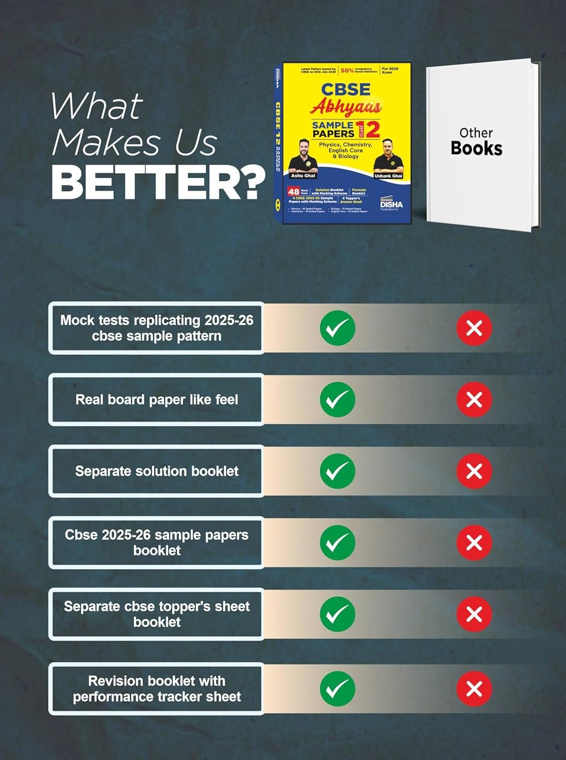 • Another Booklet containing the CBSE 2025–26 Sample Papers, of the 4 subjects, as issued by CBSE is provided to help you understand the exact pattern of the 2026 Board Exam.