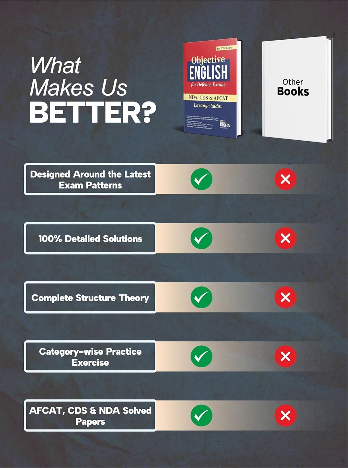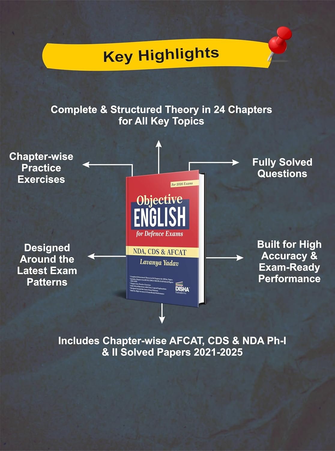 Disha latest book Objective English for Defence Exams – NDA, CDS & AFCAT by Lavanya Yadav, a qualified defence competitive exams candidate, is an exclusive book ccurated for the 2026 upcoming Exams. This book delivers guidance that is practical, exam-ready, and rooted in real challenges aspirants face. The book perfectly reflects the evolving pattern of modern defence exams and trains students to aim for high accuracy under pressure.