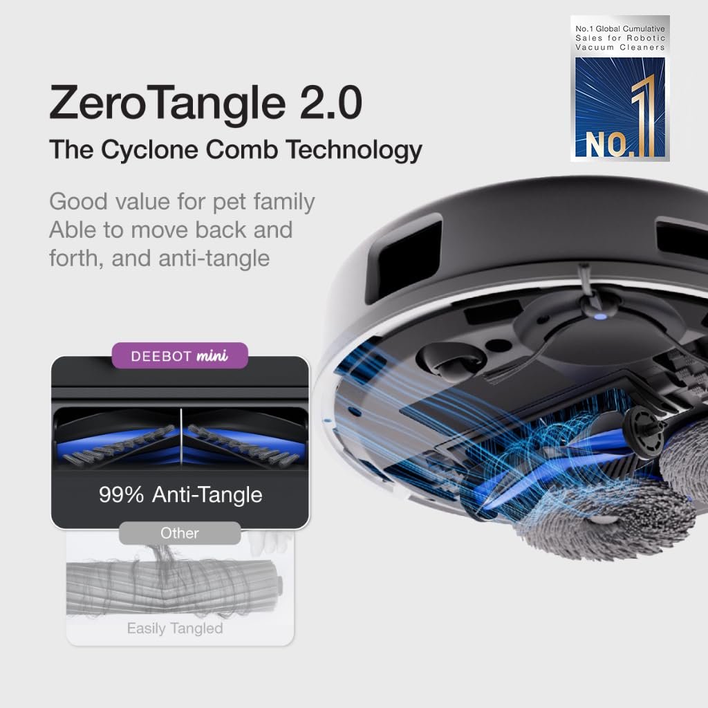ZERO TANGLE TECHNOLOGY 2.0 : Featuring the advanced ZeroTangle Anti-Tangle Technology 2.0, it ensure the cleaning efficiency stays 99.8%*. The DEEBOT MINI feature ZeroTangle 2.0 with triple V-shaped structures, which uses a 45° V-shaped anti-tangle bristle design to lift hair away, a V-shaped spiral brush to gather hair centrally, and V-shaped comb to dynamically untangle hair, ensuring efficient suction and hassle-free maintenance while achieving a high level of floor cleanliness.