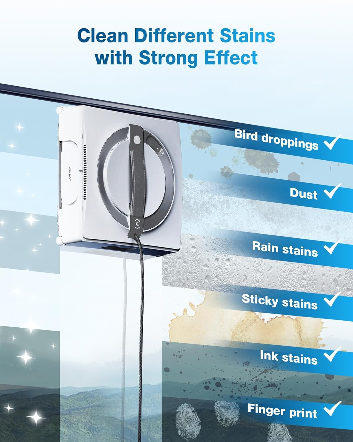 FORGET TEDIOUS HAND CLEANING: Equipped with multiple sensors, the WINBOT W2 PRO OMNI ensures uninterrupted cleaning, effortlessly bypassing obstacles. Its special along-the-edge mode improves cleaning of window edges by 65%, ensuring a pristine finish.