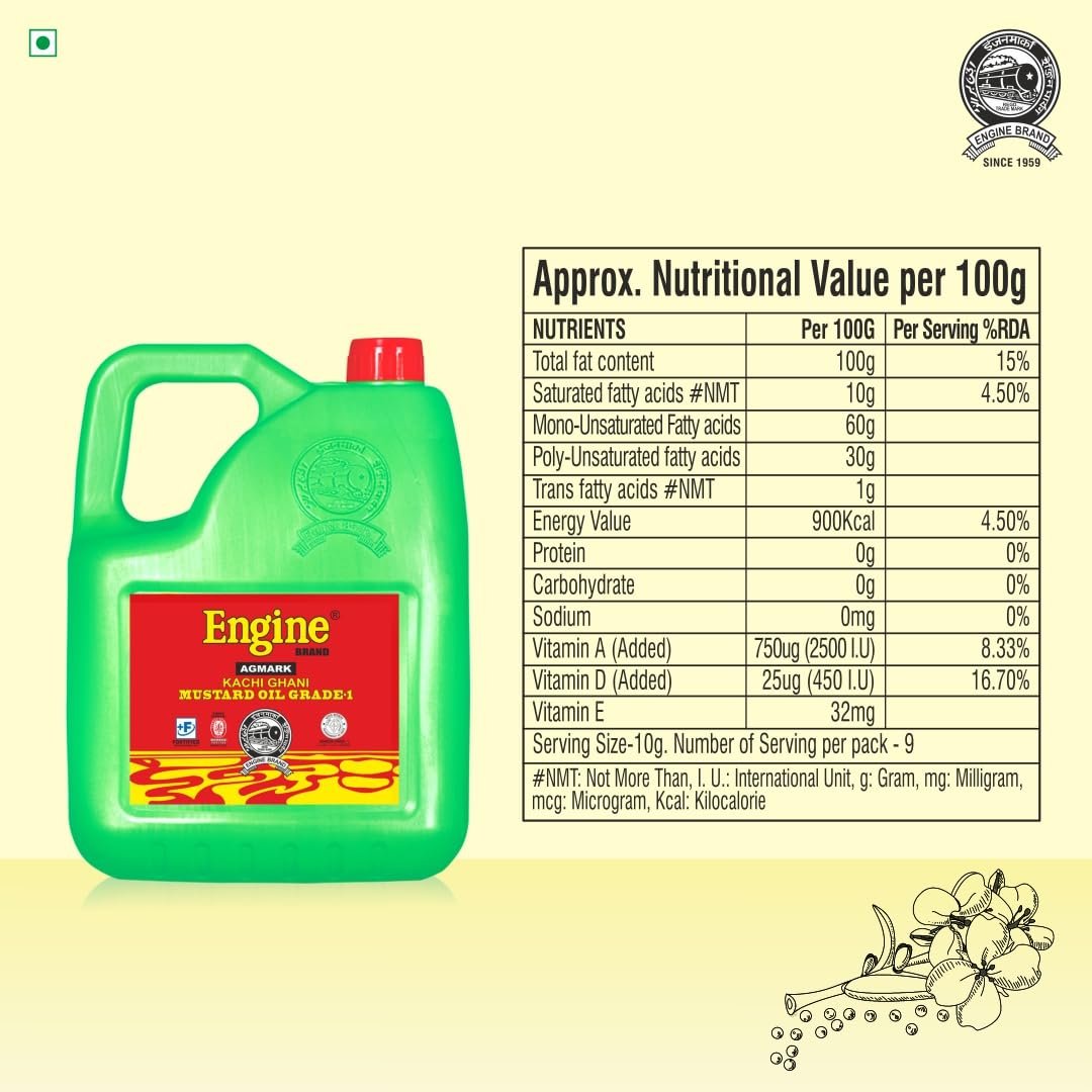 Engine Brand. Kachi Ghani Mustard Oil is Agmark grade -1 oil It is good source of Omega-3 . It heart friendly cooking oil. This kachi ghani mustard oil is also widely used for cooking foods. It contains rich aroma which is naturally achieved through extraction without adding harmful chemicals. Usage Directions: