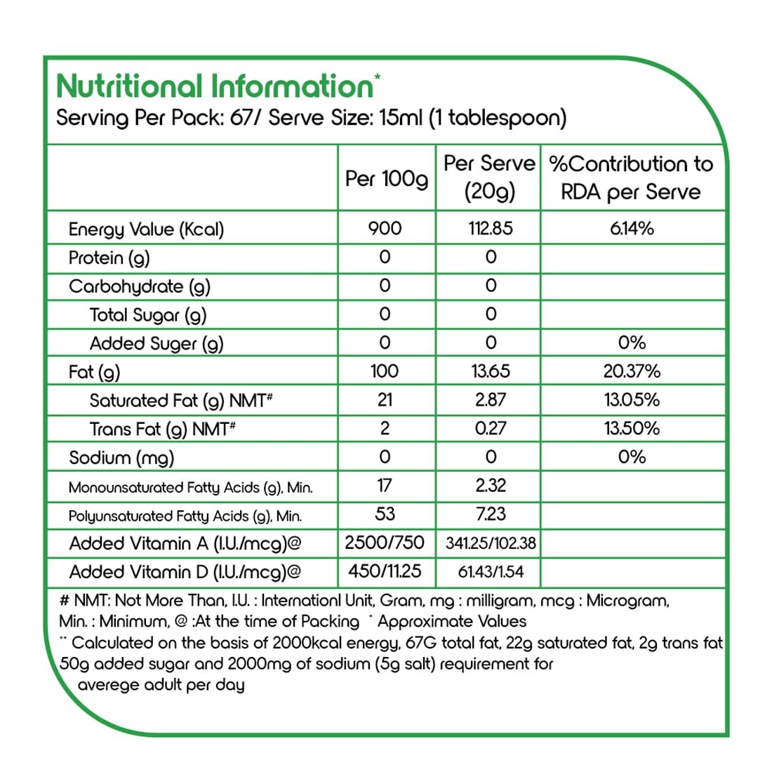 NUTRITIONAL CONTENT: Contains balanced mix of saturated (21g/100g) and unsaturated fats (70g/100g) for wholesome cooking