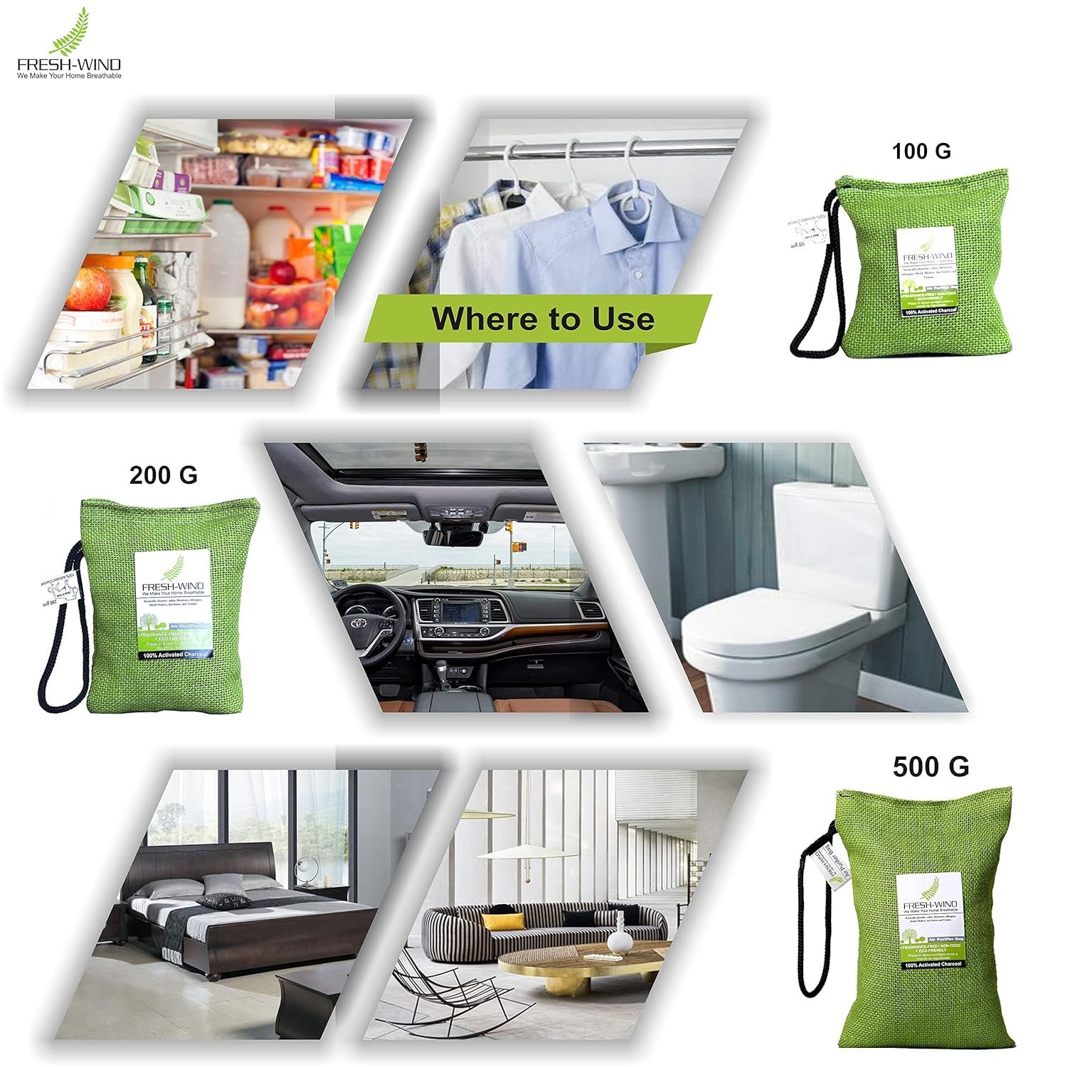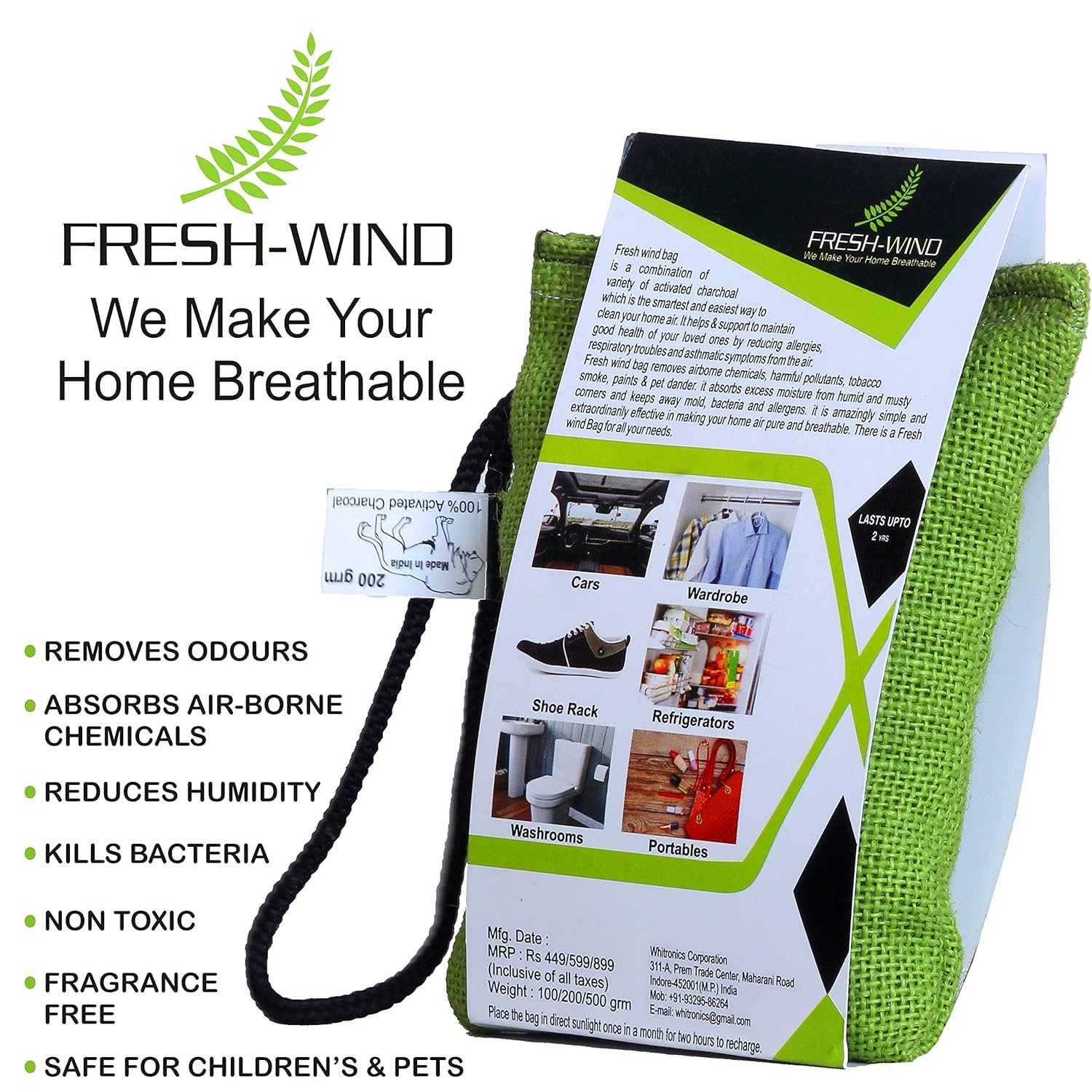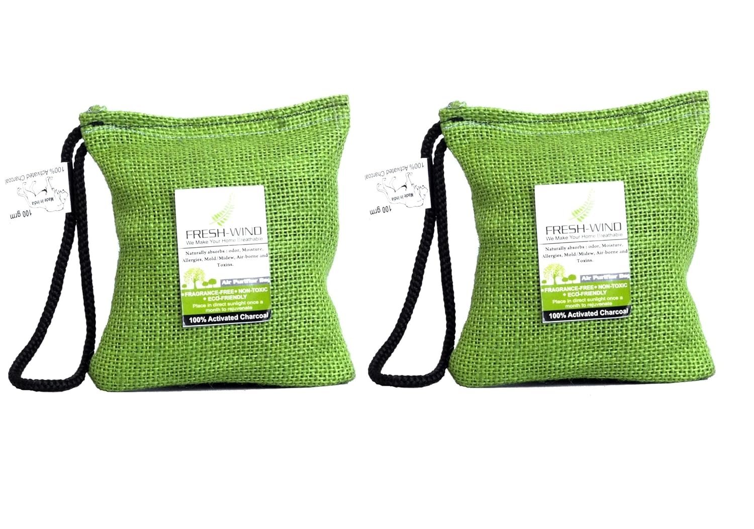 Freshwind Non-Electric 100% Activated Charcoal Air Purifier, Deodorizer, Odor Absorber and Dehumidifier for Wardrobe, Fridge, Shoe Rack, Cars and Home – 100g each (PACK OF 2)