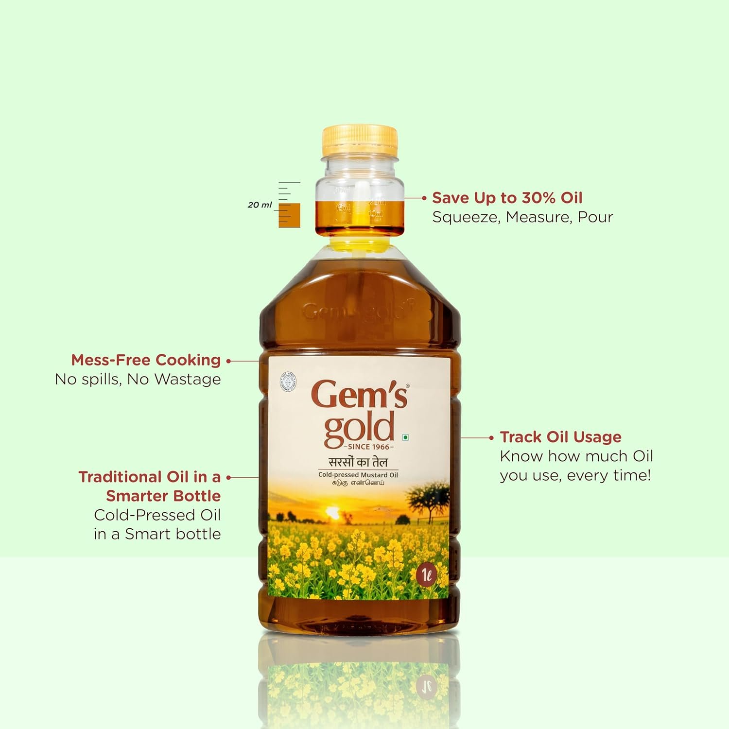 Gems Gold unrefined Cold Pressed Mustard Oil 1L | Smart Bottle | Measure every drop | kachi ghani mustard oil | Help consuming up to 30% lesser oil | FDA Certified