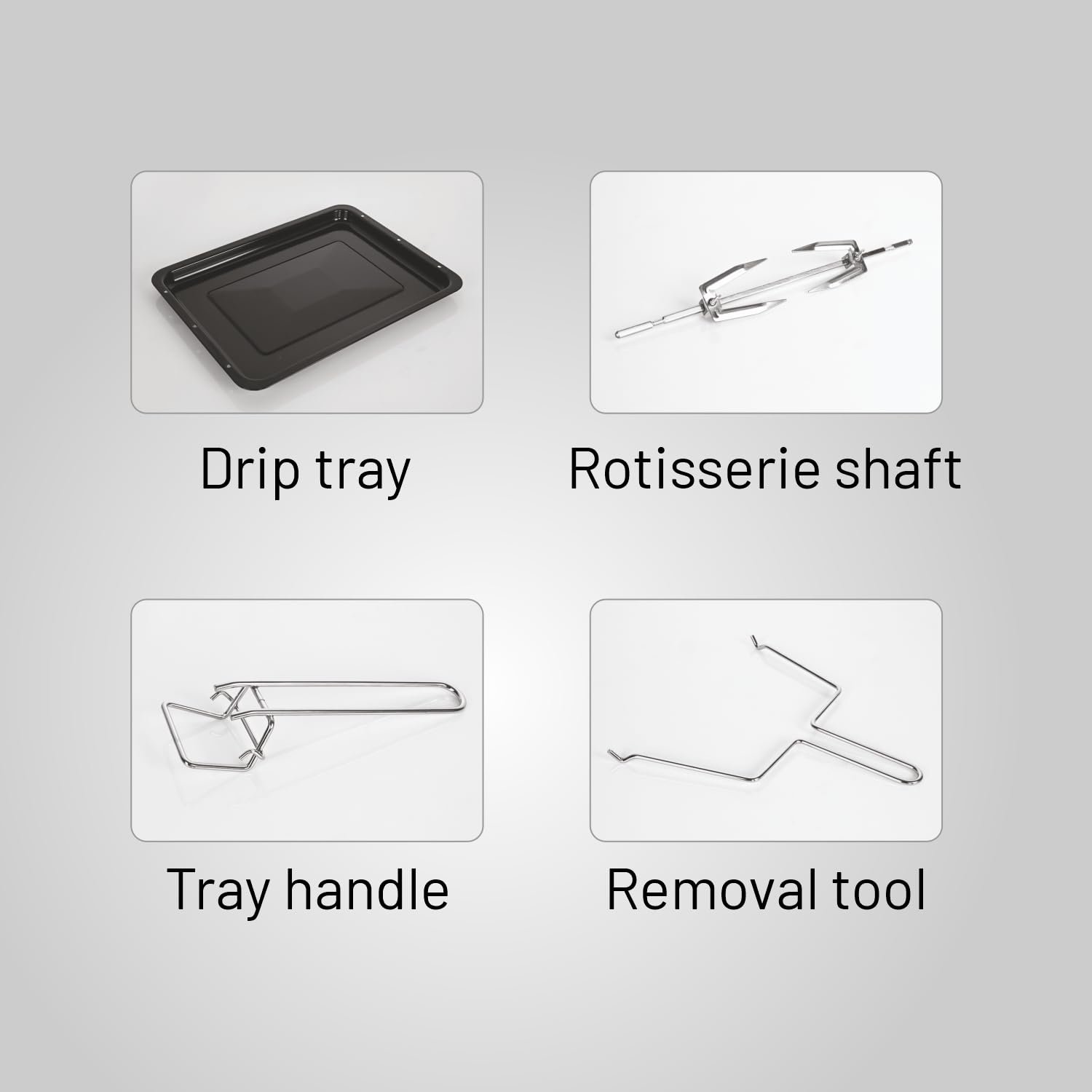 Accessories: Drip tray, Rotisserie shaft, Tray handle & removal tool