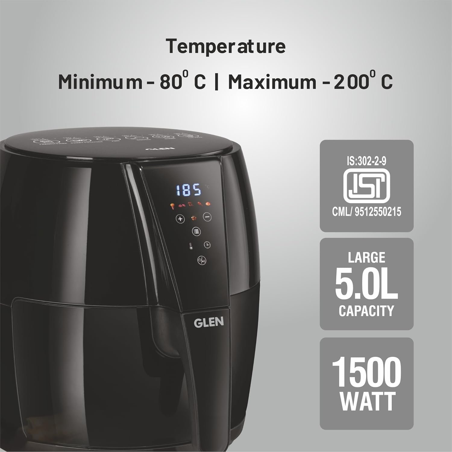 Glen Digital Air Fryer 5L, 1500W Large Airfryer with 6 Pre-Set Function, Non-Stick Basket, Auto Sleep & Shut Off, Timer & Temperature Control, Bake Fry Roast & Grill with Less Oil – Black (SA3041DIGI)