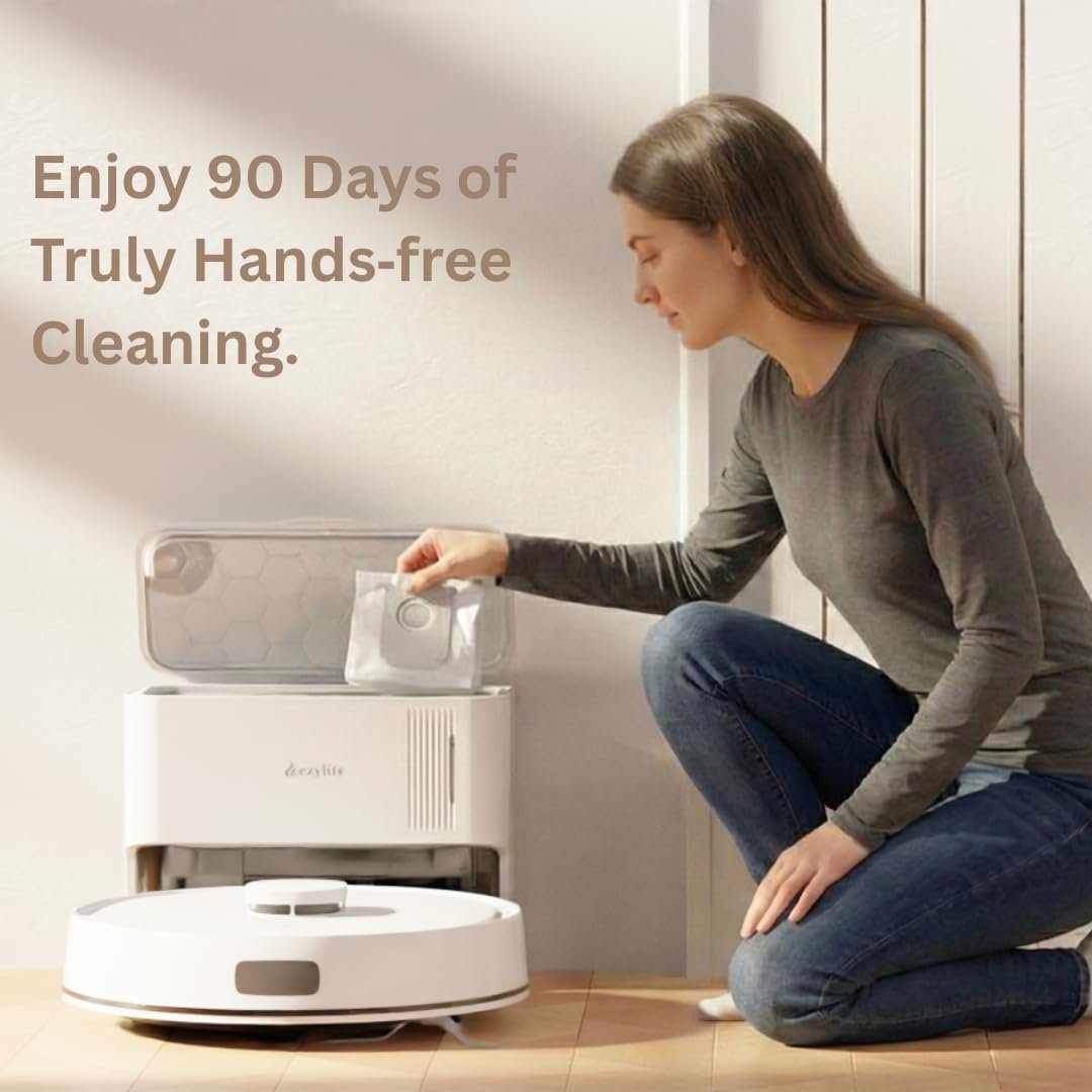 AUTO DUST COLLECTION BASE (OPTIONAL): The Glide 300 comes with the Ezylife Auto-Empty Station for automatic dust disposal. Enjoy up to 90 days of hands-free cleaning with replaceable dust bags and durable cyclone technology.