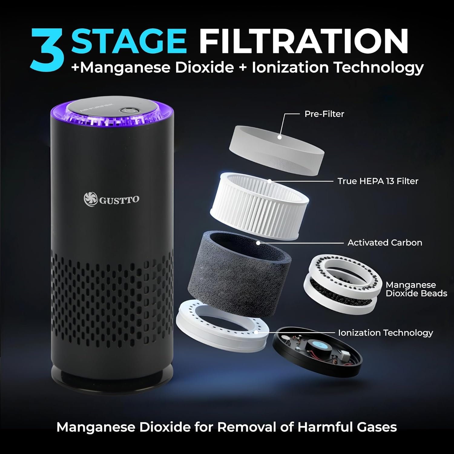 TRIPLE FILTRATION: Features a comprehensive 3-stage filtration system with pre-filter, HEPA 13 filter, and activated carbon filter. ALso come added manganese dioxide beads for superior air purification and odour control