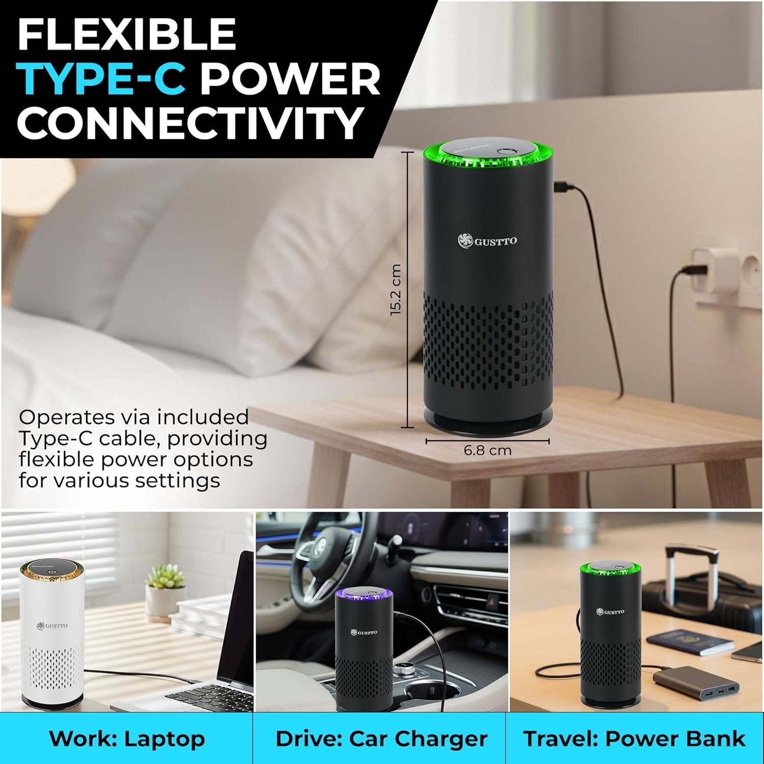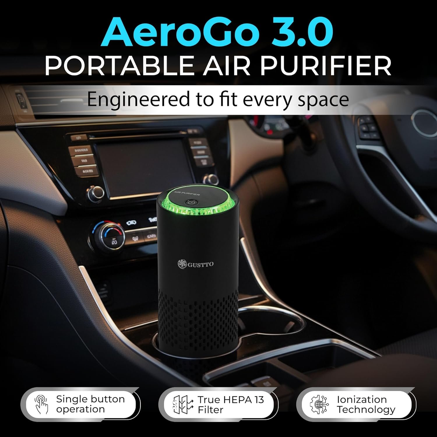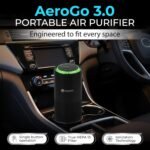 Gustto AeroGo 3.0 Car Air Purifier | 3-Stage Filtration with HEPA13 | Removes 99.997% Dust & Smoke | Negative Ion Technology | Car and Desk Compatible | Aroma Diffuser | Type-C Powered, Black