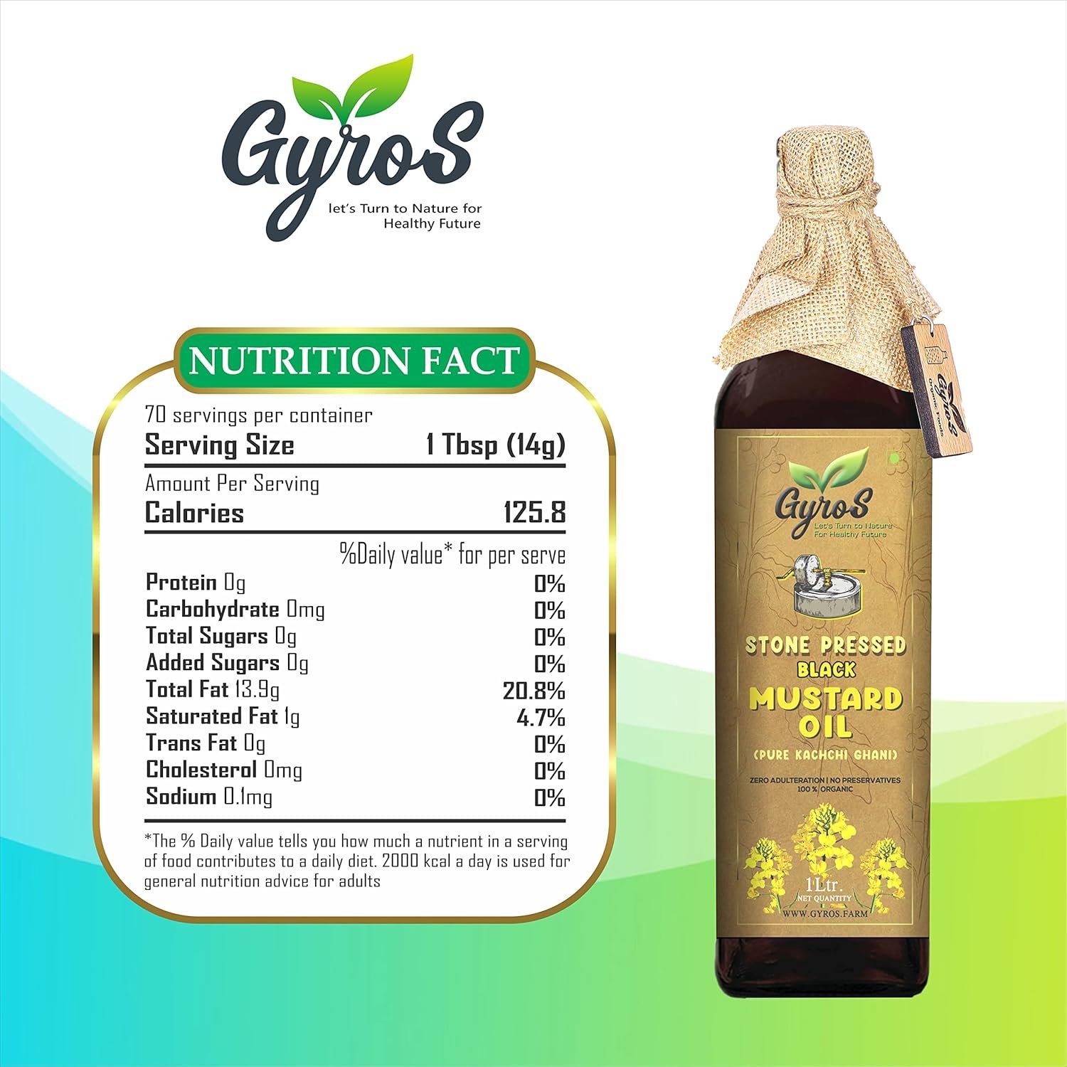 Organic Excellence: Gyros oils are sourced from organically grown ingredients, ensuring purity and quality you can trust.Stone Pressed: Using traditional stone pressing methods, our oils retain their natural flavor and nutritional value.Cold Pressed: Extracted without heat or chemicals, Gyros oils maintain maximum nutrients and health benefits.No Additives, No Adulterants: We keep it pure and simple. Gyros oils are free from any additives or adulterants, guaranteeing unadulterated goodness.