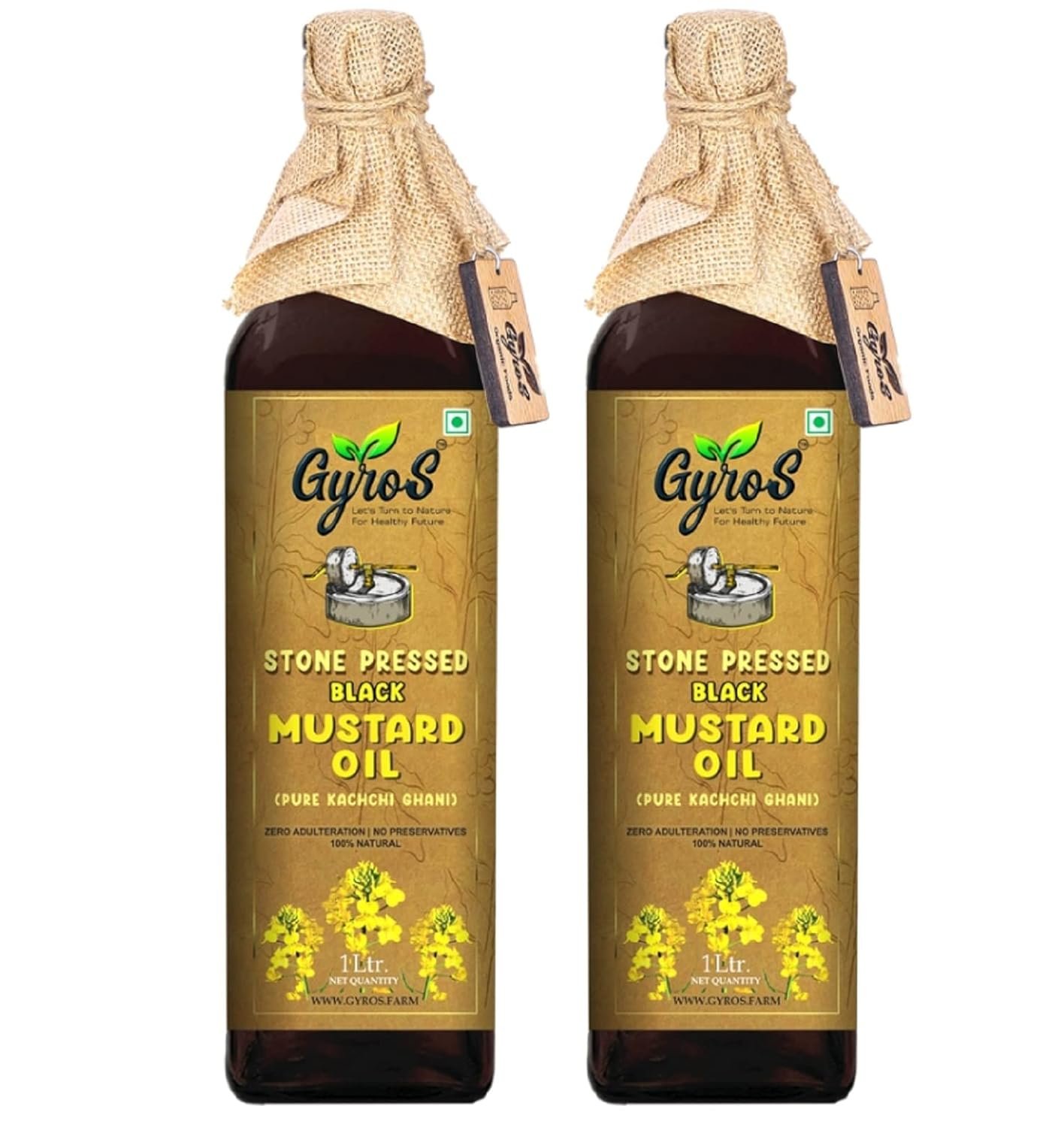 Gyros Farm Stone Cold Pressed Black Mustard Oil 1Litre| No Chemical | Kacchi Ghani | Chekku | Sarso Tel | Good for Heart |Organic | Cholesterol Free-Pack of 2 (Glass Bottle)