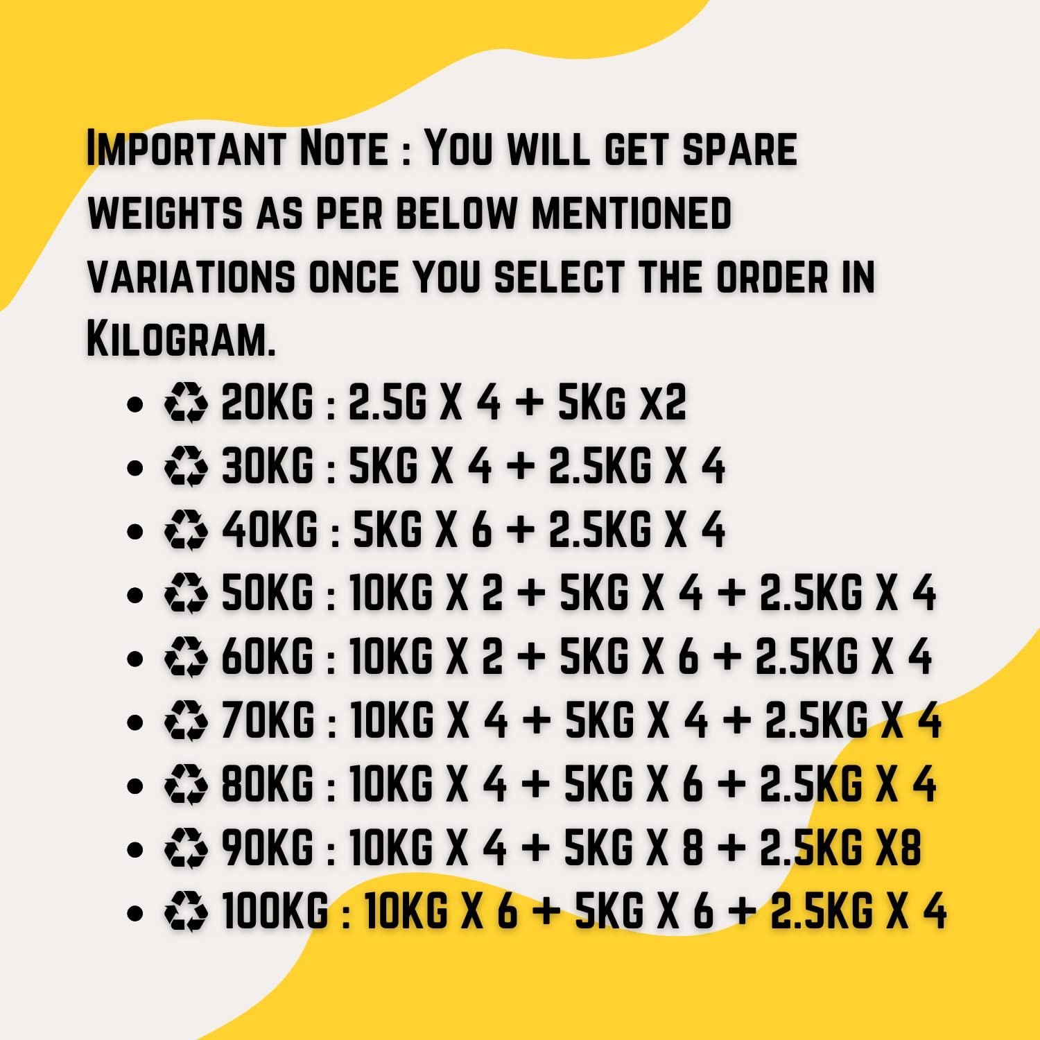 Important Note : You will get spare weights as per below mentioned variations once you select the order in Kilogram.