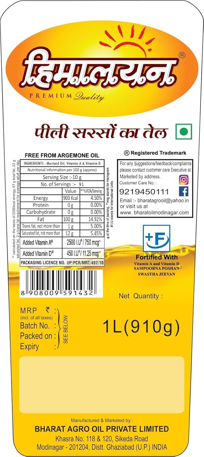 Himalayan Yellow Mustard Oil (Fortified with vitamin A and D), 1 Litre(Pack of 4)