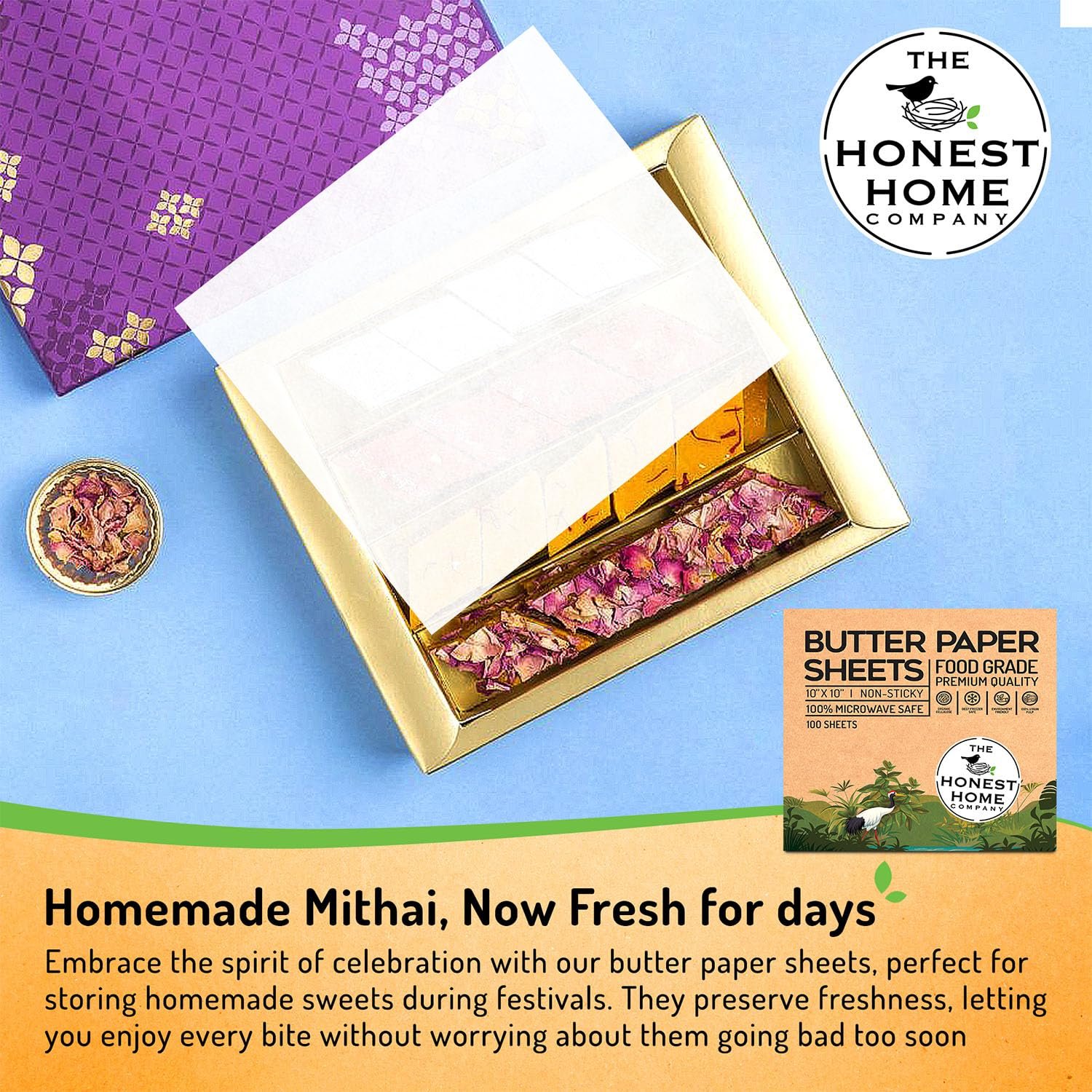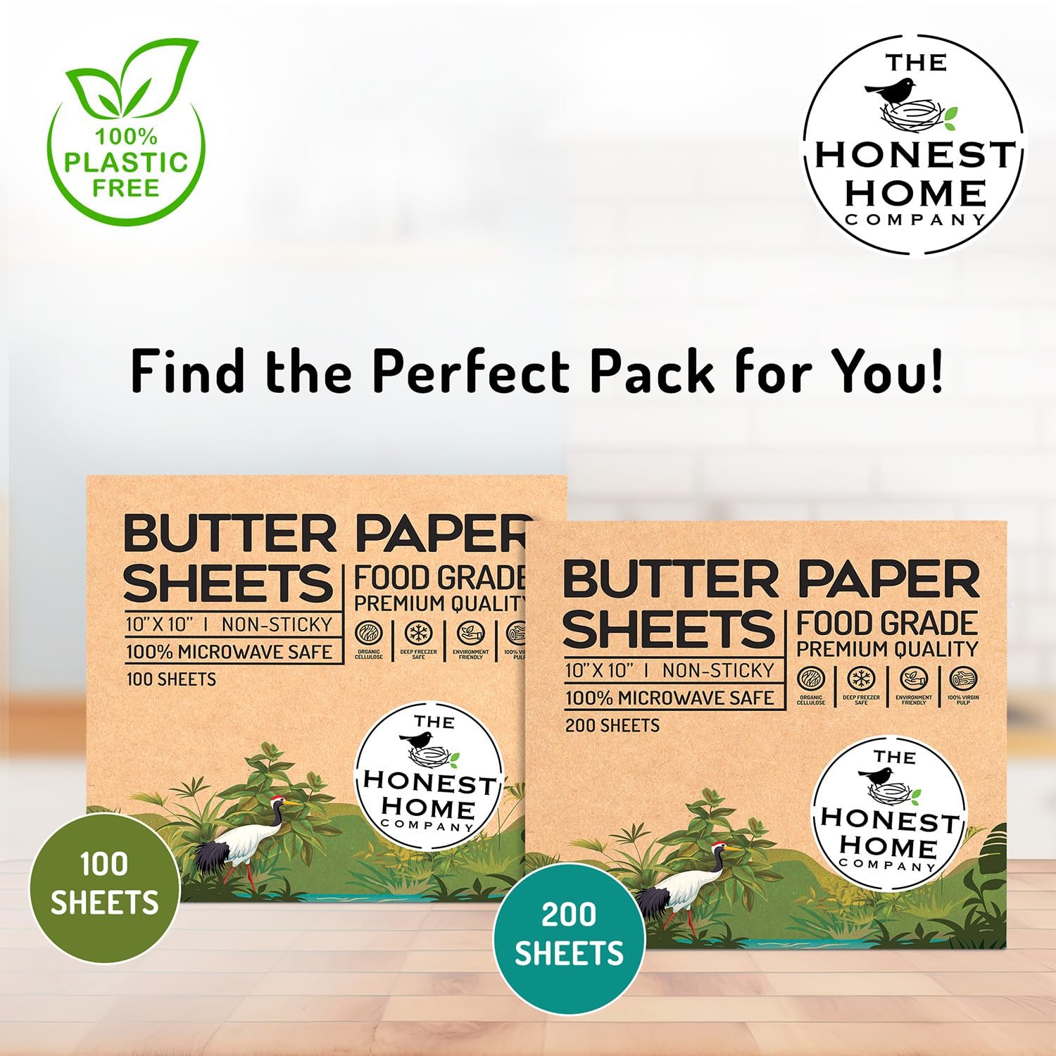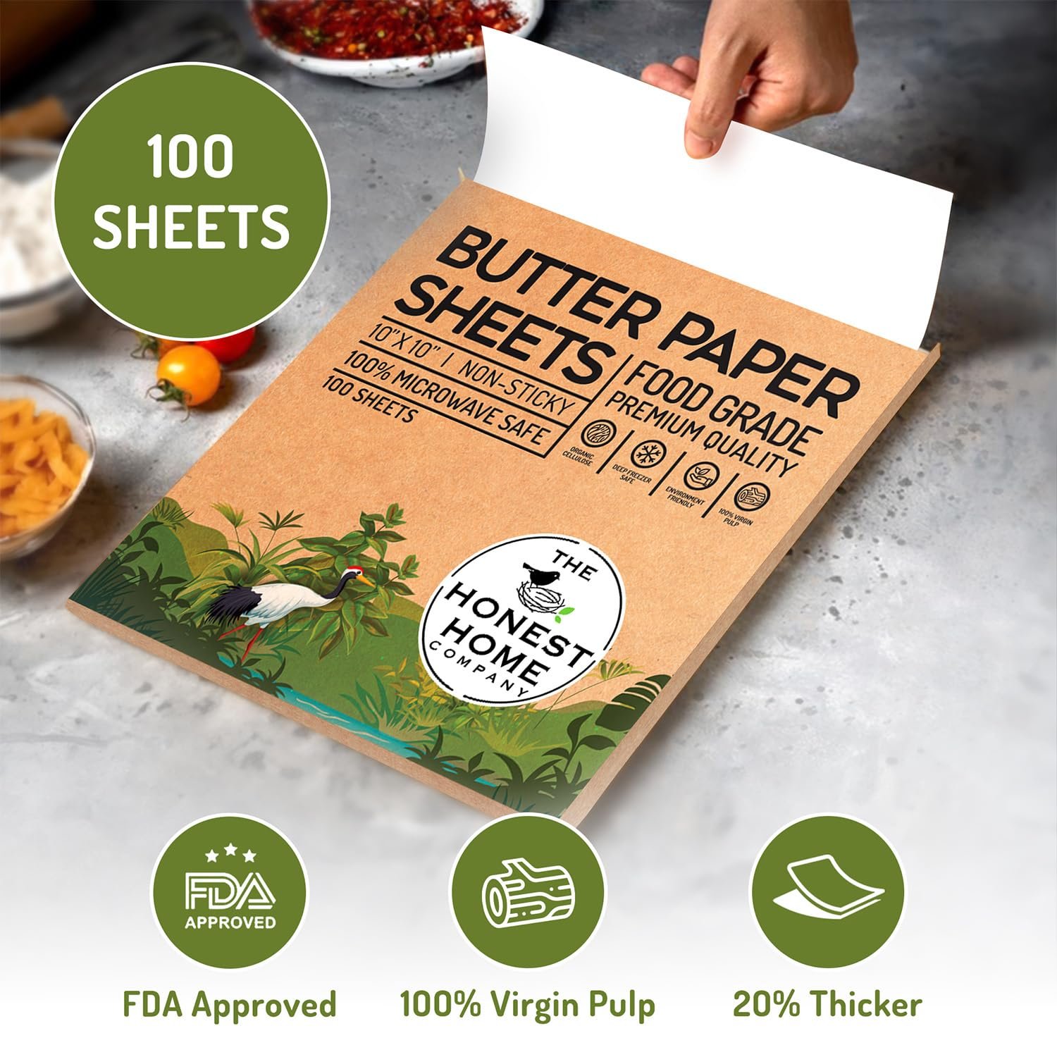 Honest Home Butter Paper Sheets | 100 Sheets | 10×10 Inch | Pre-Cut & Non-Coated | Food Safe & Non-Stick | for Baking and Air Fryer Use