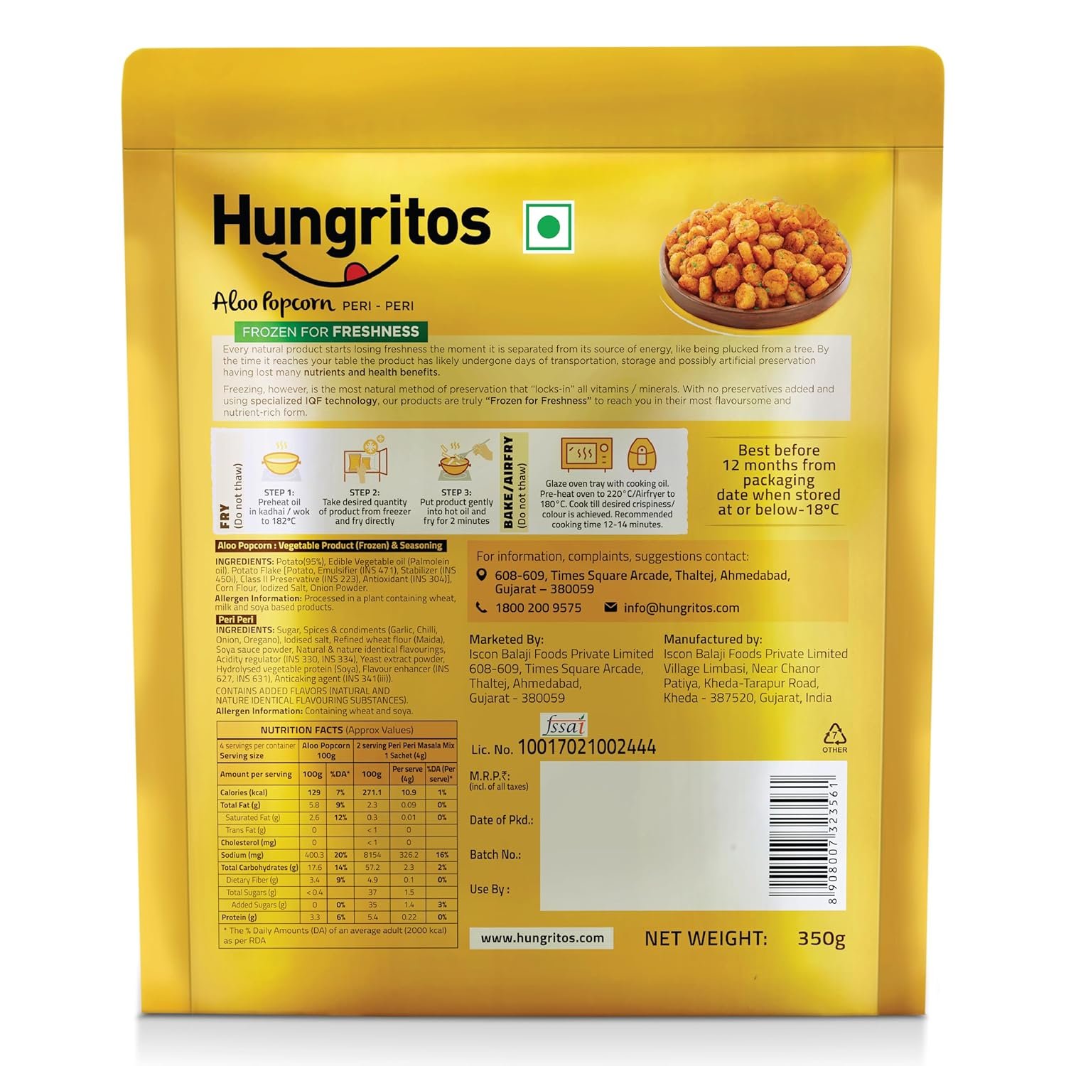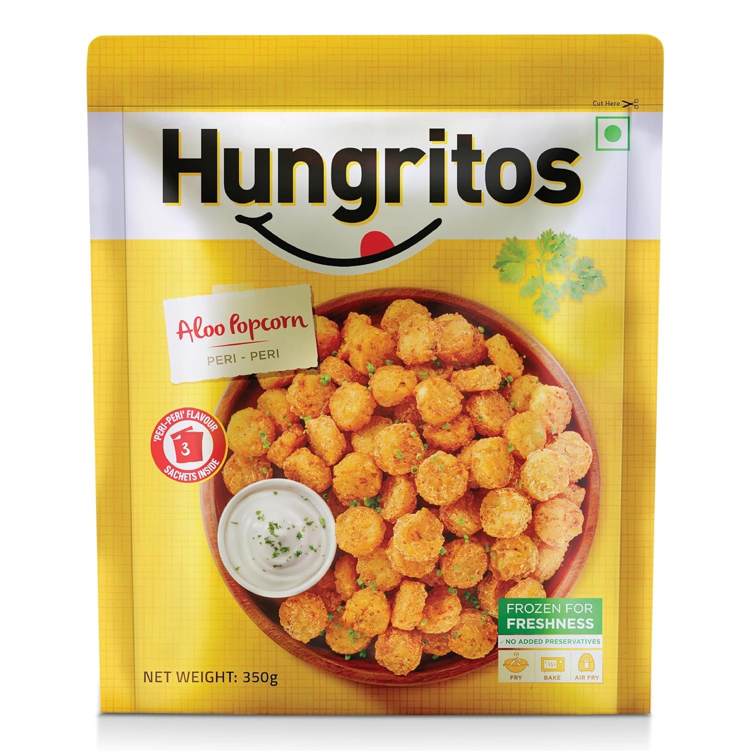 Hungritos Aloo Popcorn brings you a one-of-a-kind snacking experience with its fun, popcorn-shaped potato poppers. These crunchy-on-the-outside, soft-on-the-inside poppers come with 3 Peri Peri spice mix sachets, so you can spice them up to your liking. Whether you’re hosting a party, looking for a quick snack for the kids, or craving something different, Hungritos Aloo Popcorn is the perfect snack. Just fry, bake or air fry straight from the freezer—no thawing, no hassle. Frozen using IQF technology, these snacks stay fresh and flavorful. Make your snack time exciting with this truly unique snack that is bound to become everyone’s favorite. Crispy, crunchy, and oh-so-satisfying! Why You’ll Love It: • Popcorn – A fun, unexpected twist on your favorite snack form—crispy potato poppers. • Spice It Your Way – Comes with 3 Peri Peri sachets so you control the spice. Tangy, spicy, flavorful! • Ready in Minutes – Deep fry, bake or air fry straight from the freezer. No mess, no prep, just instant munchies. • IQF Technology – Locks in freshness, crunch, and taste—just like homemade. • Perfect for Any Mood or Moment – Be it game night, kids’ tiffin, or party platter—this snack never disappoints. • 100% Vegetarian – Made with love, and ingredients you trust. Hungritos Aloo Popcorn – Where potato meets popcorn, and your cravings meet their match!