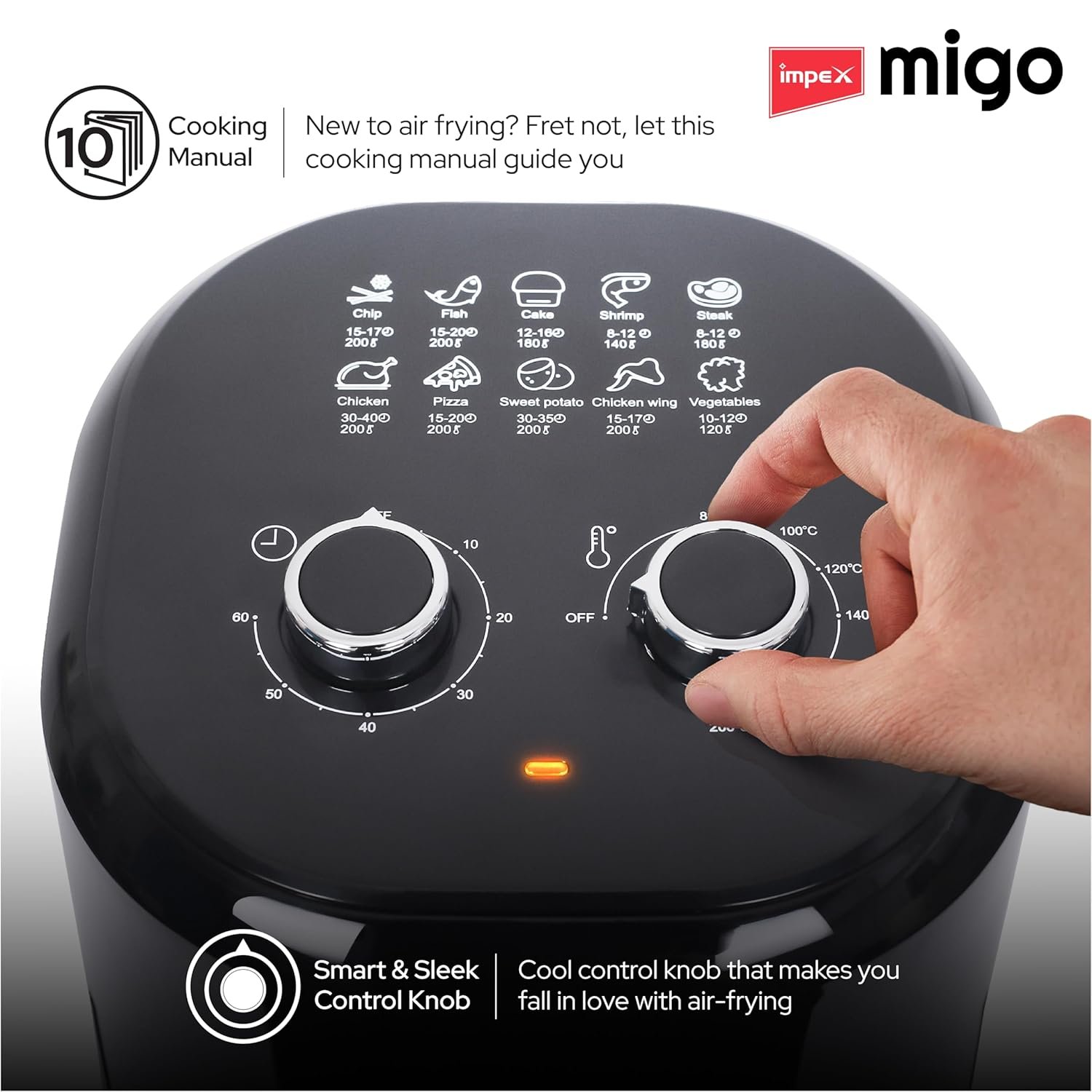 Intuitive Controls: Enjoy hassle-free cooking with two convenient knobs dedicated to temperature and time adjustments, ensuring simplicity and accuracy in every dish.