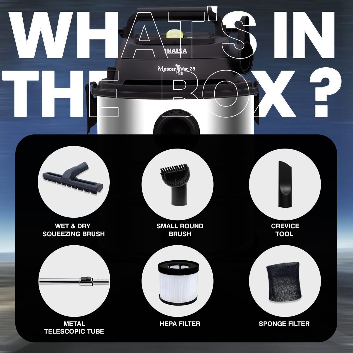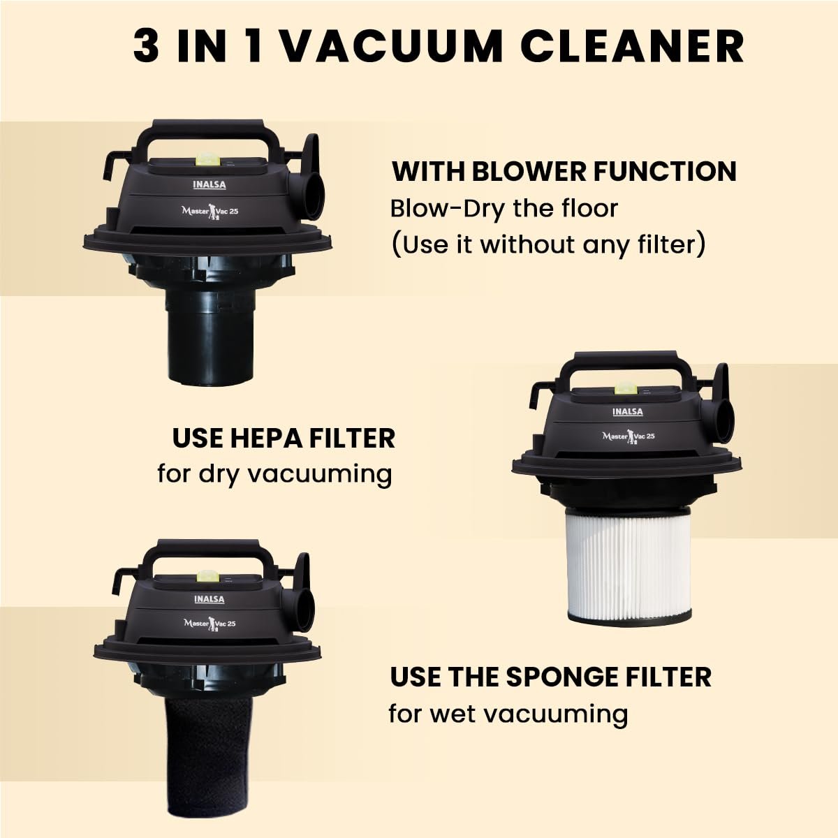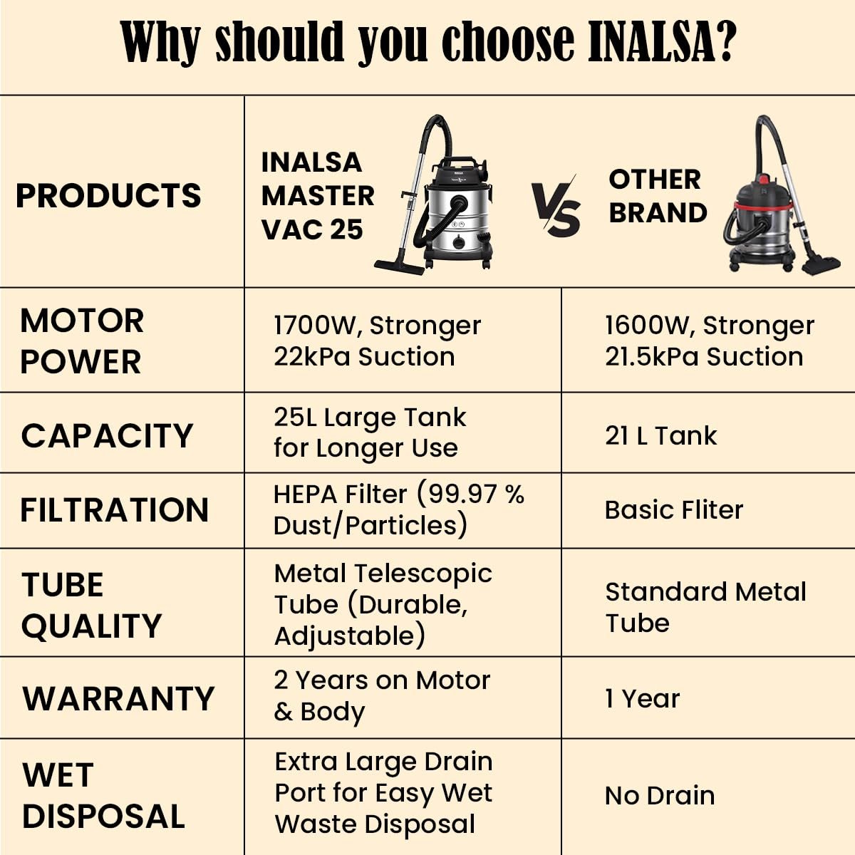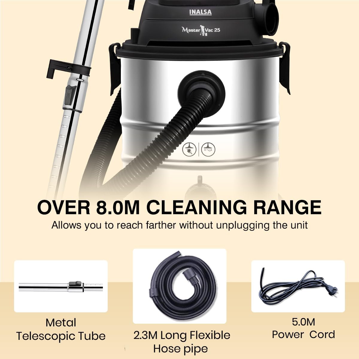 INALSA Vacuum Cleaner Wet and Dry Heavy Duty 1700 W & 25 Ltr Capacity|22KPA Suction|HEPA Filter & Metal Telescopic Tube|2 Year Warranty|SS Metal Tank|For Home,Office,Hotel Cleaning (Master Vac 25)
