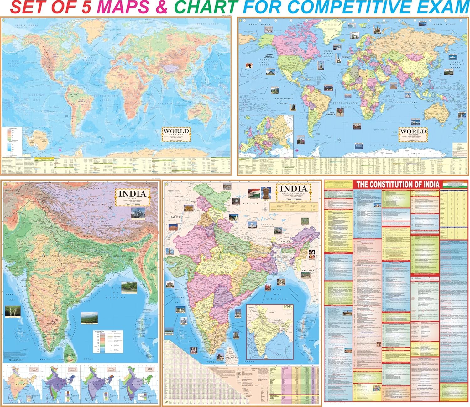India Political & Physical, World Map Political & Physical Maps and India Constitution Chart | Set Of 5 | Map Size – 70X100 cm | Use For UPSC, SSC, IES, Bank, Railway and Other Competitive Exams.