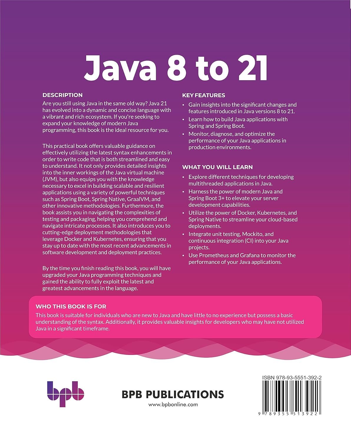 This book is suitable for individuals who are new to Java and have little to no experience but possess a basic understanding of the syntax. Additionally, it provides valuable insights for developers who may have not utilized Java in a significant timeframe.