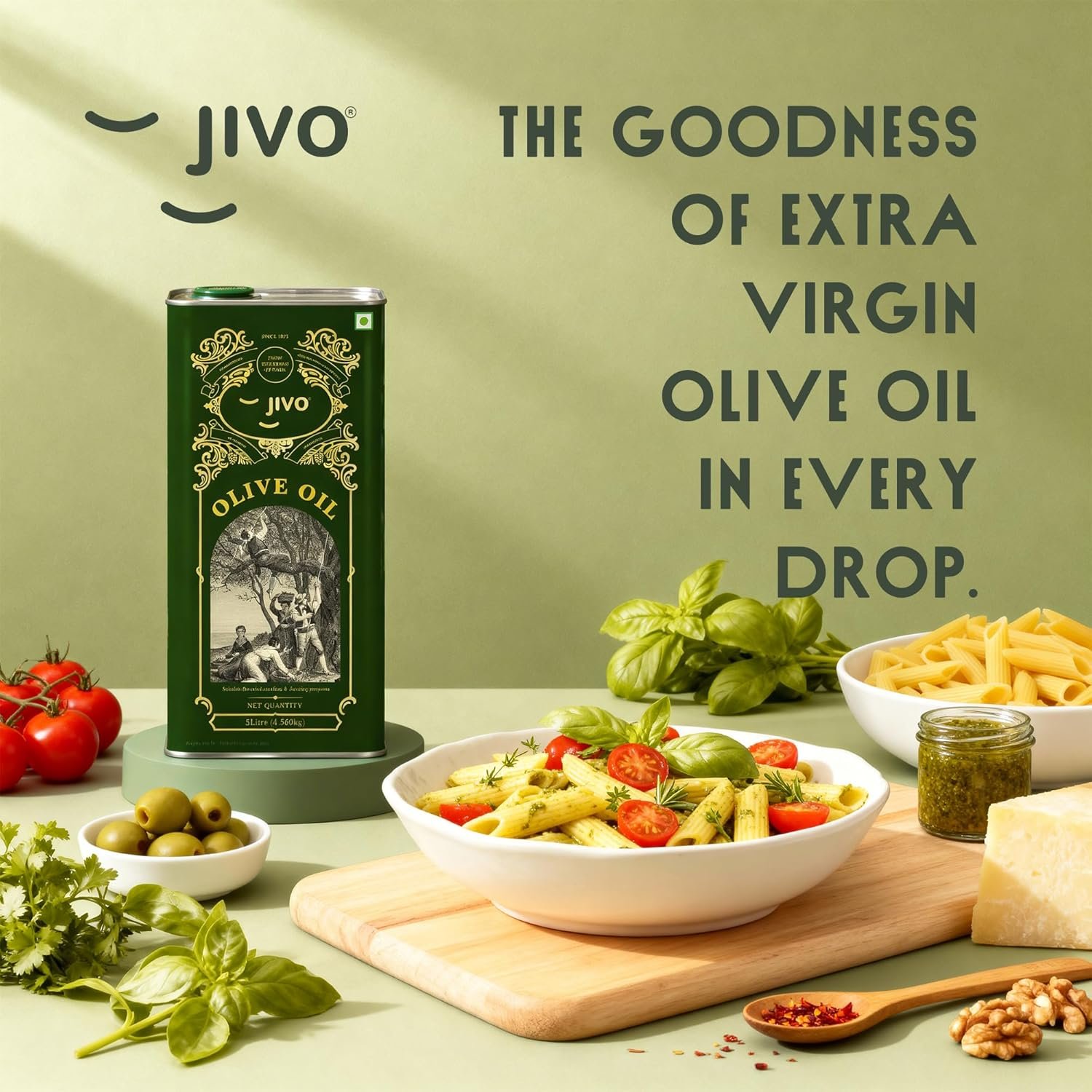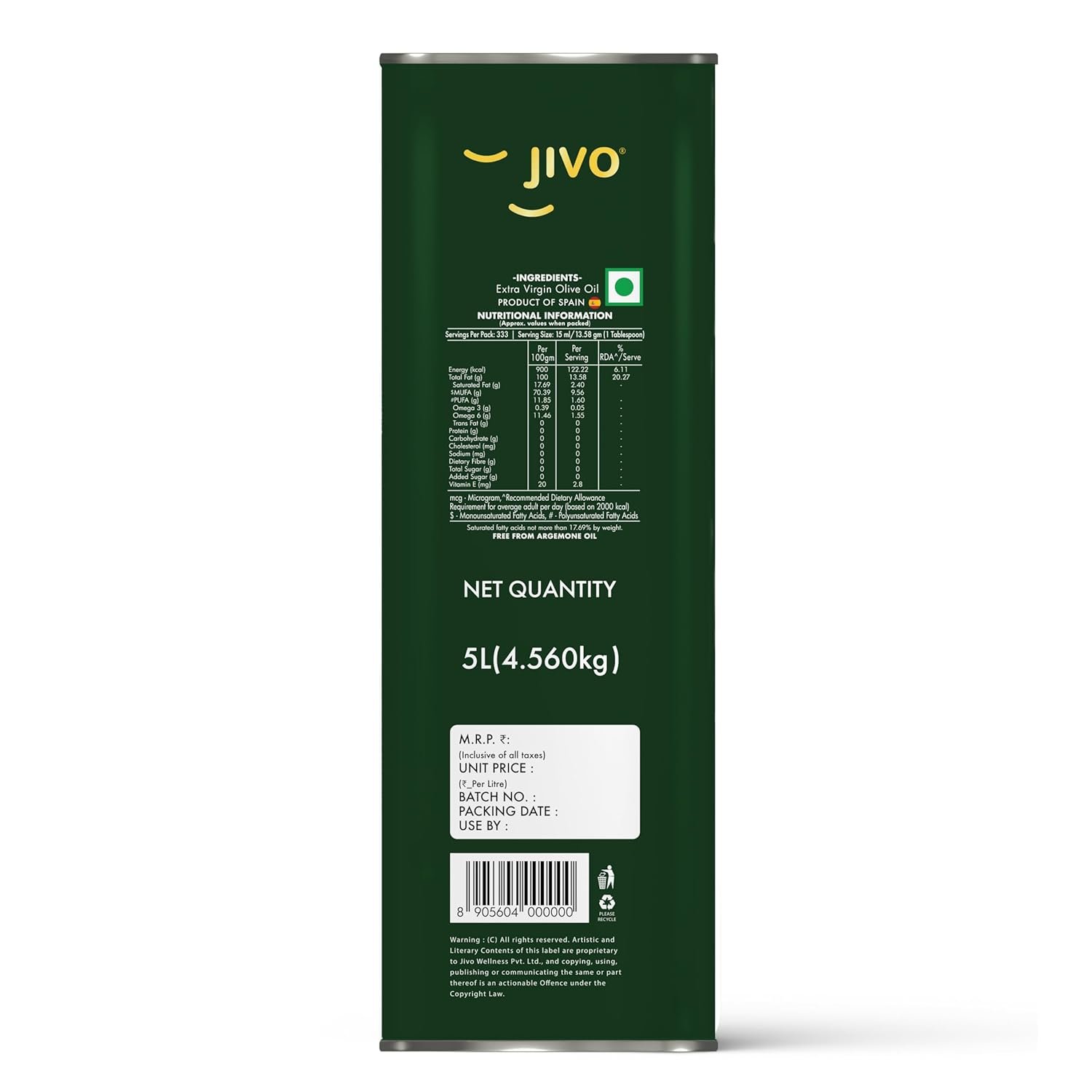 Jivo Extra Virgin Olive Oil 5 litre Tin | Imported from Spain | Contains Vitamin E | Low in Saturated Fat | Natural and Cold Pressed Cooking Oil | Ideal for Dressings, Salad and Soups, Dips & Marinades